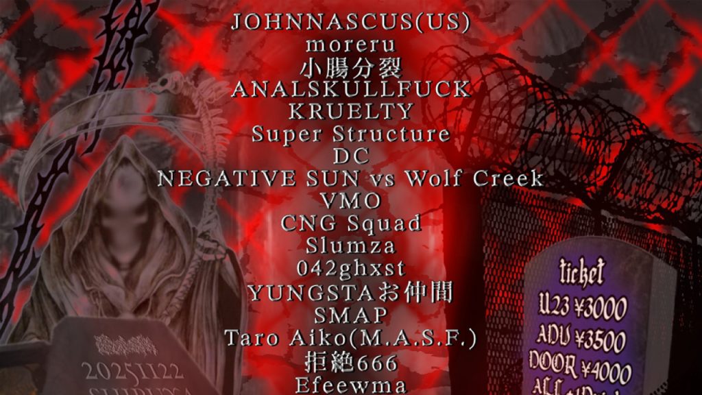 テキサスからJOHNNASCUSが初来日で登場 トゥルーパンクバンドmoreruとエクスペリメンタルハードコアバンド小腸分裂の共催により人間の奥に潜む邪悪性や凶悪性をテーマに開催されているevilspaが渋谷のWWW & WWWβにて開催。 前回からちょうど1年ぶりの開催となり、moreruの4th Album Release Tour “霊霊障障新新感感染染“の一環として企画された今回は2年ぶりに渋谷のWWW & WWWβでの開催となり、スペシャル・ゲストとしてテキサスからSpider GangやCPU Buddhaのメンバーでありソロでもデジタルハードコアやエクスペリメンタルを基調とし活躍するJOHNNASCUSを招聘。 ライブアクトにはmoreru、小腸分裂、ANALSKULLFUCKをはじめ海外ツアーを中心に活動し、国内メタル/ハードコアシーンのトップに君臨するKRUELTYや、ニュースクールハードコアの凶暴性を付け詰めたSuper Structure、ブラックメタルと電子音楽を融合した音楽性で海外を中心に絶大な人気を誇るVMO。REAL Japanese hip-hopを標榜しevilspaには計4回目の出演となる若手ハードコアバンドDC。電子音楽からの影響も感じさせる圧倒的にオルタナティブなパワーバイオレンスバンドNEGATIVE SUNとHaizai AudioとShota Izawaによる最凶ハーシュノイズデュオ、Wolf Creekによるマッシュアップライブ。 ラッパー勢にはrirugiliyangugiliと愉快な仲間達を中心に構成されるコレクティブ、CNG Squad。国内Phonkシーンの最前線を走るSlumzaと042ghxst。青森三沢出身で独特なリリックとバイブスで話題のYUNGSTA お仲間。あの国民的人気アイドルグループとは全く無関係のスカムヒップホップユニットSMAP。 奄美大島からやってきた凶悪ノイズテロリスト、拒絶666。M.A.S.F. Pedalsの主催でENDONの元メンバーでもあるTaro Aikoなど多彩なライブアクトが集結。フライヤーはmoreruのコジマアツヲが担当。 以下、小腸分裂の黒柳によるステートメント “死ぬ機会を逸した畜群は、生の意味を希求する。存在し得ない物語に縋り、愚行の果ての肯定をねだる。正しい側にあるからと励ます言葉がないならば、一歩踏み出す勇気すら持てず留まり同化する。 よしんば後押しされたとしても、それが悪魔の百計と気づくことなどありはしない。復讐求める良心の培養だけを目的に、目を皿にして贄を探す。掲げる旗は巨大でも、視野の狭さは誤魔化せない。 極楽浄土の到来を心の中で念じても、真に求めるものこそは、脳を縮める阿片のみ。闘争により勝ち取った自由意志の解放を喜び勇んでごみ山に捨て、社会の軛に頭を繋ぐ。掛け合わされた遺伝子で加速していく家畜化に抗う術を持っていない。 因果の中に身をやつし、進歩史観で慰め合う。他者との間で希釈した自己同一性に酔いしれる。広大無辺な世界に対し小さな脳で論説し、狂わぬ中に正気を見出す。 時代と場所を飛び越えた網に絡み取られたこの現代、知足安分を目指すなら、人の形を捨てる他ない。無意味を説いて、無意味に死ねるか。その覚悟を持てるのか。今ここで答えを示すため、生への共感という十分条件を捨てよ。最期に抱く心根を誰かに共有するのなら、もはやそれは。“ EVILSPA 9 -moreru 4th Album Release Party- 2025/11/22 SAT 20:00 – 05:00 at WWW & WWWβ U23 ¥3,000 / ADV ¥3,500 / DOOR ¥4,000 (+1D) TICKET: https://t.livepocket.jp/e/20251122www SPECIAL GUEST: JOHNNASCUS [US] ANALSKULLFUCK Akane CNG Squad DC DIV⭐︎ Efeewma Kanon KRUELTY Mayhem Squad (Egomania × KYLE MIKASA) moreru Rosa NEGATIVE SUN