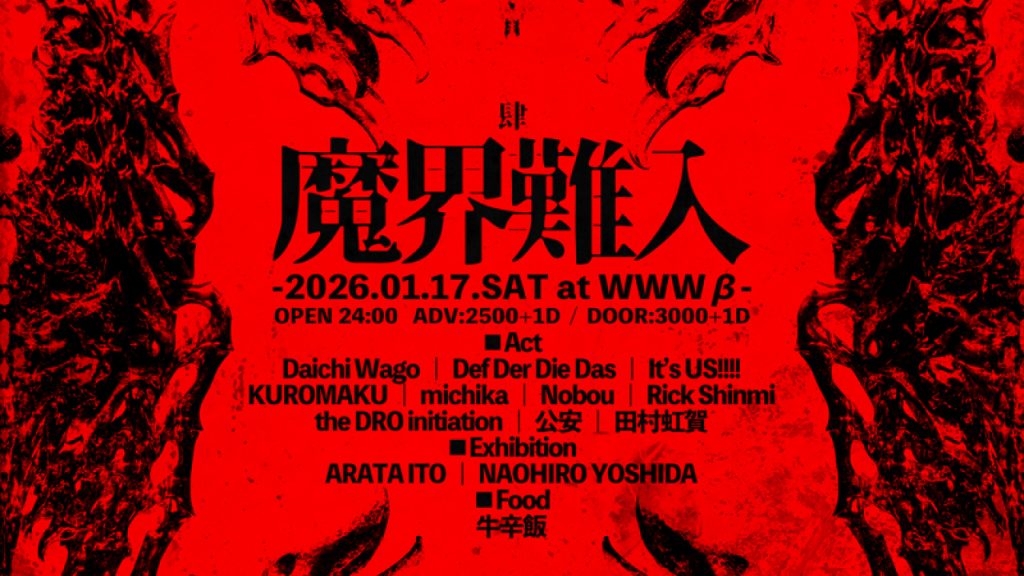 2026/1/17 WWWβ 「仏界易入、魔界難入(仏界、入り易く、魔界、入り難し)」。禅僧の一休宗純が語った言葉を題として引用した本集会は、さまざまな前衛的表現者たちが集合し、名状し難い異空間(=魔界)を観客と共にフロアに出現させる祝祭、もしくは新しい暴動の一形態である。 4回目の開催となる今回はWWWβにて開催。前回に引き続き、凶暴なまでの個性を持つ表現者たちがそれぞれの感覚世界を炸裂させる。あらゆるコミュニティが均一化していく現代において、土着的な祝祭の構造に立ち帰り一夜限りの新しい「祭り」を勝手に捏造し、熱狂と幽玄を生み出す。 Naohiro YoshidaとARATA ITOが「祭壇」をモチーフに合作した大作品を設置。平時とは異なる呪術的な様相のWWWβを舞台に、Daichi Wago / Def Der Die Das / It‘s US!!!! / Nobou / the DRO initiation / 公安 / 田村虹賀らによる予測不可能なライブアクト、KUROMAKU / michika / Rick Shinmiらによる想像力豊かなDJセットがゼロ距離で展開される。また、本番中のあるタイミングで、大作品がその表情を一変させる瞬間にもご注目いただきたい。 創造や表現、そして体験に伴う深い集中の果てに何か大きなものとつながる感覚。 “”2026“”が来る。 関東をかけていくまっくらな速度。 この街が立ったまま朽ち果てていることに、 まだ誰も気づいていない。 ガラスの箱は意味のない反射を繰り返し、 やがて、本当の静寂が訪れる。 わたしたちは東京に「見えない火」を放ち、 新たなるマツリを捏造することにした。 架空の焔の祝祭、 蜃気楼の神々による金属舞踊、 魔界難入 vol.4 を開催する。 FLYER DESIGN : ARATA ITO ◆開催:1月17日(土)OPEN 24:00 CLOSE 29:00 ◆会場:WWWβ 〒150-0042 東京都渋谷区宇田川町13-17 ライズビル地下 ◆⼊場料:ADV:2500+1drink DOOR:3000+1drink ◆チケット購入:https://ja.ra.co/events/2331504 ◆主催:ARATA ITO, NAOHIRO YOSHIDA, Nobou, Daichi Wago ※ 追加情報は「魔界難入」SNSにて随時発表。 https://www.instagram.com/makai_irigatashi/