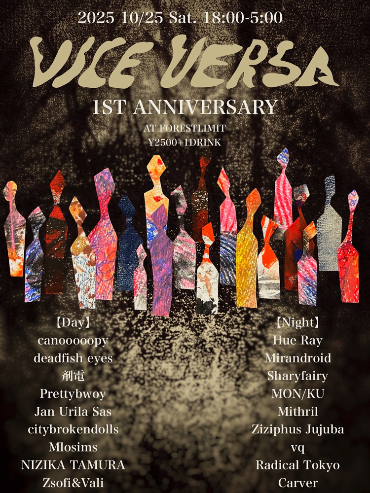 5/27 幡ヶ谷 Forestlimit 「Vice Versa」の第9回目が5月27日に幡ヶ谷Forestlimitにて開催。今回は空間の広がりを意識した多幸感が溢れるようなコンセプト。 アップリフトでメロディックなトランスが特徴的なsineが本イベントにて初のライブパフォーマンスを行う。yolabmiはモジュラーシンセによる、エクスペリメンタルでアンビエントな雰囲気を作り出し、未来と過去を同時に感じさせる。DJは宇宙チンチラ、Xamd、mlosims、Ziziphus Jujubaの個性的なメンバーを揃え、それぞれ異なった物語を奏でる。 Vice Versaは主に幡ヶ谷Forestlimitで開催するイベントで、「新たな価値観とインパクトを与えるイベント」を目指して、10月から本格始動した。運営全員が名古屋出身であり、ブッキング、DJ、VJ、フライヤーをそれぞれ担当している。Vice Versaは日本語で「逆もまた然り」。無限に存在する音楽スタイルを全て受け入れ、尊重し合う空間にしていきたいと考えている、とのこと。 – Vice Versa 9 日時:2025年5月27日(火) 会場:Forestlimit 幡ヶ谷 19:00スタート 料金:2000円+1D <Live> yolabmi sine <DJ> 宇宙チンチラ Xamd mlosims Ziziphus Jujuba <Flyer> Ziziphus Jujuba