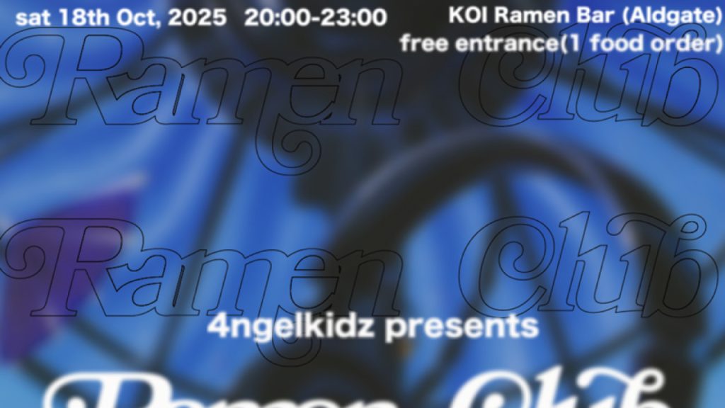10/18 KOI Ramen Bar (Aldgate) 現在、ロンドンと東京を拠点に活動する姉妹オーディオビジュアルユニット、tamanaramenによるパーティークルー4ngelkidzが、2025年10月18日にイギリス・ロンドンのラーメン屋「KOI Ramen Bar (Aldgate)」にてラーメン屋をテイクオーバー。 DJの仲間たちと乗っ取りを試みる。don gordon、jt_yoh、luca wowczyna、ODG、Taigen Kawabe(Bo Ningen)が出演。 – Ramen Club 2025 10.18(sat) 20:00-23:00 Venue:Koi Ramen Bar (Aldgate) entrance free(1food order) DJ don gordon jt_yoh luca wowczyna ODG Taigen Kawabe(Bo Ningen) tamanaramen