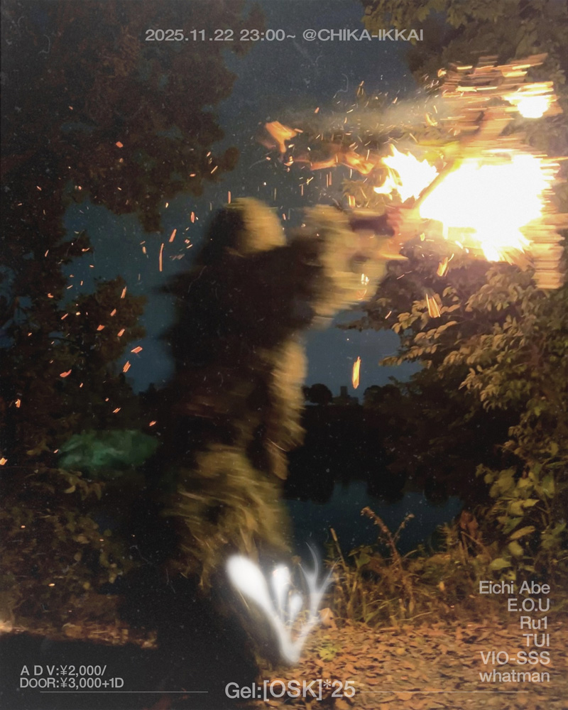 8/30 FORESTLIMIT 関西を拠点とするVIO-SSSによるクラブミュージックにフォーカスしたパーティーシリーズ〈Gel〉の第一回目が東京・幡ヶ谷FORESTLIMITにて開催。 「東京でも大阪でもどこに建ててもそれはVIO-SSSの居場所。音と光とひとがVIO-SSSのホームを作り出す。一夜限りの”家”にあなたを迎え入れます。」 都市と郊外を越境する音度 関関東西地下から空へ── 深酔ハイウェイ、風を裂いて – Gel:[TYO]*25 2025.08.30 22:00- at FORESTLIMIT ADV: ¥2,300/ DOOR: ¥2,800+1D https://t.livepocket.jp/e/vio-sss_geltyo25 dj woahhouse Frog3 Hue Ray nano odorine Xamd [hybrid set] VIO-SSS Flyer: ネオアームストロングサイクロンジェット砲