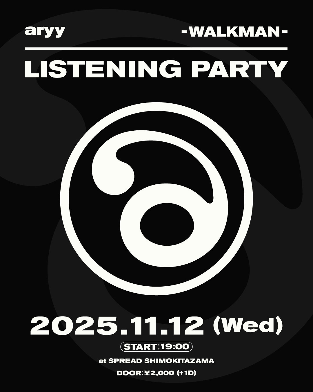 また、アルバム『WALKMAN』のリリースに先駆けて、11月12日(水)に下北沢SPREADにてリスニングパーティを開催。ライブでは、aryyが『WALKMAN』収録曲を全曲初披露するほか、ライブアクトにiga、DJにarowの出演が決定。新章の幕開けを告げる夜として、aryyが描く“WALKMAN”の世界を一足早く感じられる場となる、とのこと。
