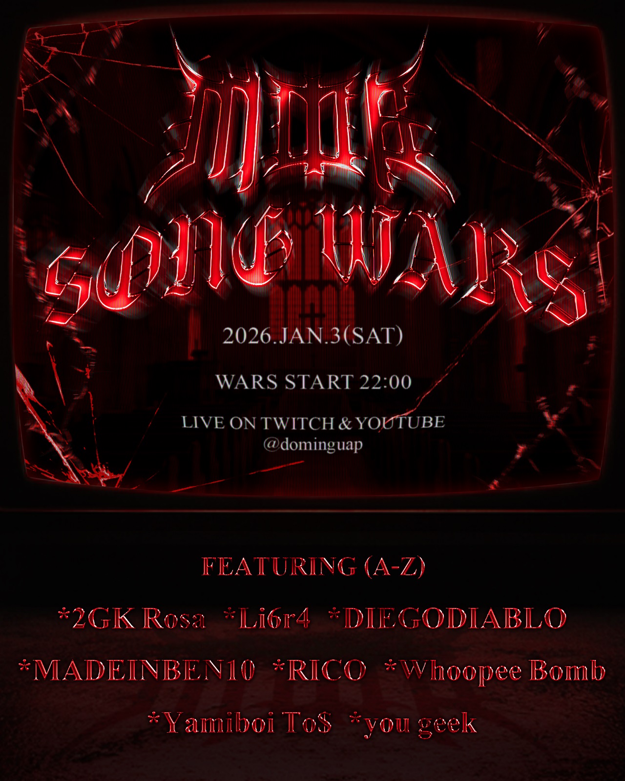 Twitchストリーマー・dominguapが主催するオンラインHIPHOPイベント「#MOB_SONGWARS」の第4回が2026年1月3日(土)に開催。今回もTwitchとYouTubeにて生配信を予定している。