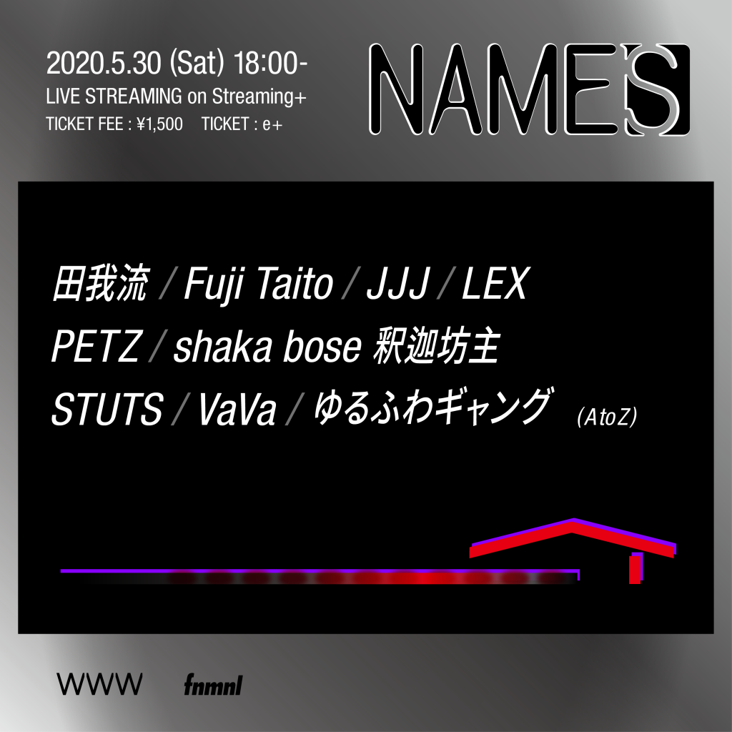 5月30日開催 東京・渋谷のヴェニューWWWとウェブメディアFNMNLが、初の共催となる生配信イベント「NAMES」を5月30日(土)に開催。日本全国のヒップホップリスナーがそれぞれの場所から高揚感を得ることができる、新たな体験の場としてオンライン生配信される。 出演者には、昨年3rdアルバム『Ride On Time』を発表、今年1月から全国のクラブを巡るLOCAL WAVEツアーを行っていた”田我流”、現在最新作を制作中でトラックメイカーとしてもラッパーとしても絶大な信頼を誇る”JJJ”、初のライブアルバム、『STUTS Band Set Live ”90 Degrees”』をリリースして注目を集める”STUTS”、YENTOWNの一員であり、今年2月にWWWで行われた”COSMOS” Release Tour Finalも大盛況となった”PETZ”、12月に『Cyver』、1月には『Mevius』をリリースし全国ワンマン・ツアーを開催中だった”VaVa”、本日最新曲”Ah”をリリースしたばかりのNENEとRyugo Ishidaによる唯一無二のユニット”ゆるふわギャング”、自身のパーティー『TOKIO SHAMAN』でリキッドルームを満員にするなどサイケデリック・スピリチュアルな独自の世界観を確立する”釈迦坊主”、群馬発のクルーBRIZA所属、ハードなリリックと爆発的なパフォーマンスで話題を呼ぶ2020年最注目の”Fuji Taito”、惜しくも初の全国ツアーが中止となったなか最新EP『NEXT』を発表、kZmやJP THE WAVYのアルバムでの客演も話題となった”LEX”という9組が出演。 配信はe+による有料ライブ配信サービス「Streaming+」にてWWW Xから生配信となる。 タイトル:NAMES 日程:5月30日(土) 時間:18:00~ ※Streaming+(e+による有料ライブ配信サービス)にて生配信 チケット:¥1,500 e+ (※5月23日(土)10:00~5月30日(土) 22:00までチケット発売、24時間アーカイブ配信あり) LIVE:田我流 / Fuji Taito / JJJ / LEX / PETZ from YENTOWN / shaka bose 釈迦坊主 / STUTS / VaVa / ゆるふわギャング (A to Z) 詳細:https://www-shibuya.jp/schedule/013099.php