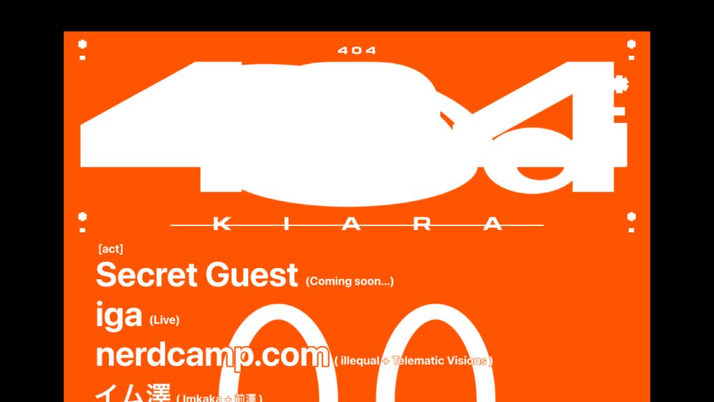 3/1 RINKAITEN 関西・神戸を拠点に、「Mercurius」「Vo」などのパーティを手がけてきたImkakaが、「Mercurius」の後続となる新たなイベントシリーズ「404」を立ち上げ、初回を3月1日に神戸RINKAITENにて開催。 Liveには後日解禁のsecret guestの他、昨年「our」や「東京」など印象的な作品を重ねてリリースしたiga、opening actとして奈良発のミクスチャーロックバンドNISCが出演。DJが紡ぐフロアのグルーヴを縫うように、それぞれのLive actが差し込まれる構成となる。 DJには、東京を拠点に制作、DJ、Liveを横断して活動し、それぞれがマルチネレコーズ20周年イベントへの出演したことも記憶に新しいTelematic Visionsとillequal によるユニットnerdcamp.com が関西初プレイ。また、music fmの一員としての活動とは異なるベクトルで、個人名義のDJとしても確かな存在感を放つ星山星子も東京より初来神する。続いて、関西にとどまらず各地で存在感を放ち、京都・West Harlemにて主催企画も手がける rimi、昨年大阪・地下一階にてTechno主体のイベントを成功させた新鋭UTAをブッキング。 主催の Imkaka は、先日上京し爆発的な活躍を見せる 前澤 とユニットを組み、普段とは異なる四つ打ちのセットを繰り出す。 フライヤーは鬼車が担当し、関西ローカルのメンバーからfoodとフリーマーケットも出店。当日会場では、Disaster BabyデザインのオリジナルTシャツも販売予定。神戸で新たなスタートを切る「404」の初回。入り口は広い。とのこと。 – 「404/KIARA」 2026/3/1 (Sun) 17:30–23:00 @神戸RINKAITEN Adv ¥2,500+1D DOOR ¥2,900+1D [Act] Secret Guest(Coming Soon…) iga (Live) nerdcamp.com(illequal + Telematic Visions) イム澤(Imkaka+前澤) 星山星子 rimi UTA [Opening Live] NISC [VJ] sachia [Flyer] 鬼車 [FLEA MARKET / FOOD] multiple vendors