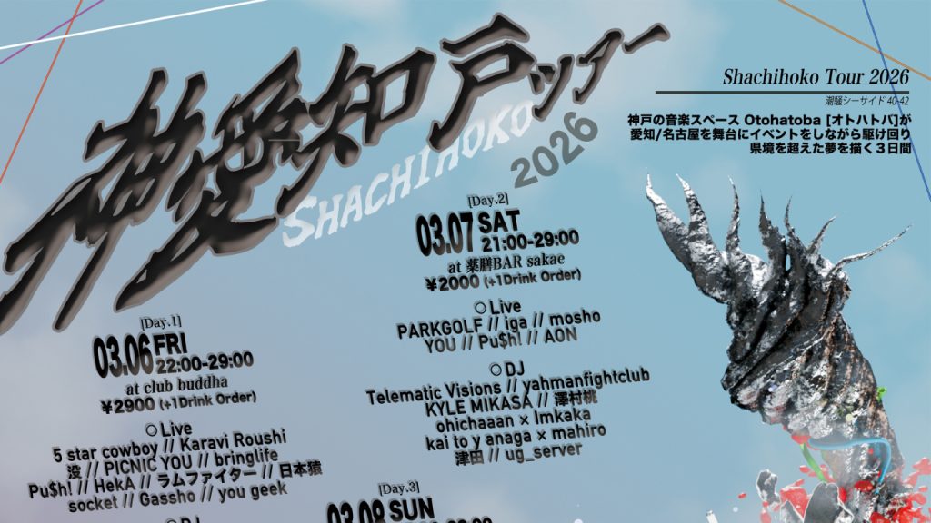 club buddha、薬膳BAR sakae、Gallery & Bar COMMON 兵庫・神戸の音楽スペースOtohatobaが、2026年春先に、昨年には東京都内で行なったライブハウス/クラブを巡るイベント主催ツアーを、本年は愛知・名古屋を舞台に敢行する。 神戸と愛知の更なる融合、そして友好を目指すべく当て文字で『神愛知戸 -SHACHIHOKO- ツアー』と名付けられたこの催しは、club buddha、薬膳BAR sakae、Gallery & Bar COMMONとそれぞれにシーンと特性を持った店舗を順に巡っていく。 その場所との相性や特性にに合わせながらコンセプトやラインナップが組まれており、5 star cowboyやPARKGOLFにOVERFALLなど昨年のリリースが話題になったアクトをはじめ、シーンを牽引する重鎮から注目度の高い若手までブッキング、そして何より特筆すべきはどの会場にも神戸、愛知に縁のあるアーティストが登場することである。 アーティストだけでなく、オーガナイザーや店舗も日本を巡っていくようになってきた令和のシーン。 点在するオルタナティブが線で結ばれ円を目指す日。 興味が湧いたら是非目撃してみてほしい。 各イベントの開催日程やラインナップは以下のようになっている。 (いずれも当日券のみ) – 【神愛知戸 -SHACHIHOKO- ツアー】 [Day.1] 3/6(金) 22:00-29:00 @club buddha ¥2900 (+1Drink Order) ︎ Live 5 Star Cowboy // Karavi Roushi // 没 // PICNIC YOU // bringlife // Pu$h! // HekA // ラムファイター // 日本猿 // socket // Gassho // you geek ︎DJ nami de zzZ //