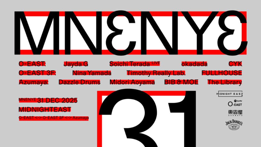 12/31 MIDNIGHT EAST Spotify O-EASTとDJバー・東間屋がお送りする「MIDNIGHT EAST」が、今年もカウントダウンイベント「MNENYE」を開催。ヘッドライナーには、グラミー賞ノミネート経験を持つDJ/プロデューサーのJayda Gが登場。 Fred again..との共作「Both Of Us」をはじめ、Taylor SwiftやDua Lipaへのリミックス提供、GlastonburyやCoachellaといった世界的フェスへの出演など、勢いのあるDJの一人である彼女が、スペシャルロングセットを披露する予定。 国内からは、日本ハウスミュージック界のパイオニア・Soichi Teradaが、3年連続で「MNENYE」のカウントダウンアクトを務める。さらに、今月MIDNIGHT EASTにて都内では7年ぶりとなるOpen to Lastセットを行うokadada、これまでに結成8周年イベントやLogic1000との共演などメモリアルなパーティーでMIDNIGHT EASTへ出演してきたCYKが登場する。 O-EAST 3Fには鎌倉出身でロンドンを拠点に活動するNina Yamadaが登場。彼女は「Jazzy Sport London」の創立者として知られ、Mix Mag 2023年ベスト10ミックスに選出された経歴も持つ。また、DJそれぞれの感性を生かしたジャンルレスな幅広いダンスミュージックにフューチャーしたプレイが特徴のDJコレクティブFULLHOUSE、今年活動20周年を迎えたZuyack、Ngtom、Sisi、Tosi、Kon、y.による可変型B6B・Timothy Really Lab.が新年のフロアに混沌と狂喜を出現させる。 東間屋はMidori Aoyamaキュレーションのもと、Dazzle Drums、BIB & MOE、The Libraryといった、ハウスミュージックをベースに幅広い選曲が持ち味のベテランから新鋭まで、彩り豊かなラインナップが出揃った、とのこと。 タイトル:MNENYE (ミッドナイトイーストニューイヤー) 日程:2025年12月31日(水) 会場:MIDNIGHT EAST (Spotify O-EAST ⇄ O-EAST 3F ⇄ Azumaya) 東京都渋谷区道玄坂2-14-8 OPEN/START: 20:00 LINE UP: -O-EAST- Jayda G Soichi Terada -LIVE- okadada CYK -O-EAST 3F- Nina Yamada (Jazzy Sport London) Timothy Really Lab. (Zuyack,Ngtom,Sisi,Tosi,Kon,y.) FULLHOUSE (SAMO,kengotaki,r1ku,issa) -Azumaya- Dazzle Drums Midori Aoyama BIB &