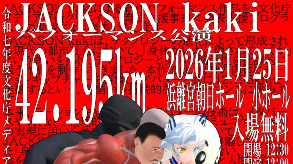 1/25 浜離宮朝日ホール 小ホール 以下、info 肉体の摩耗、電子の崩壊。その42.195kmに、境界はあるか。 JACKSON kakiによる新作パフォーマンス作品を、文化庁メディア芸術クリエイター育成支援事業の助成により発表いたします。 JACKSON kakiは、テクノロジーの進化によって形成される現代の都市社会において、「身体がいかに隠されていくか」という問いを掲げ、テクノロジーと身体の関係性を批評的に扱う作品を制作してきました。本作では、自身の肉体にモーションキャプチャーを装着し、アバターと共に42.195kmを走破するという、過酷かつ持続的なパフォーマンスに挑みます。 本来、モーションキャプチャーやアバターの技術は、メタバースやVRなど、物理的制約から解放されたコミュニケーションの実現に用いられています。しかし本作においてJACKSON kakiは、そのテクノロジーが切り離してしまった「身体性」や「時空間の制約」に改めて向き合い、あえて肉体を酷使することで、もう一つのテクノロジーと人間の在り方、共存の可能性を提示します。 パフォーマンスの舞台は、朝日新聞社が所有する舞台ホールである「浜離宮朝日ホール」となります。JACKSON kakiの普段の作品の発表の場である、クラブやギャラリーを超えて、ホールを舞台にし、ライブ上演となるパフォーマンスとなります。その中で、JACKSON kakiはアバターと連動しながら42.195kmを走り抜きます。観客は、ひたすらに走り続ける彼の姿と、リアルタイムで変容・崩壊していくアバターの映像を目撃することになります。 42.195kmという距離は、言うまでもなくフルマラソンに相当し、一般人が挑戦するには高度な準備が必要とされる距離です。その過酷さゆえに、完走するという行為自体が一つの物語性を持ち、社会的な記号として共有されています。しかしJACKSON kakiは、アスリートではなく、むしろ標準的な中肉中背の一般成人男性であり、その走行には特別な技術的意義があるわけではありません。 それでも彼は、テクノロジーと肉体がぶつかり合い、共鳴する瞬間のなかに、人間存在の輝きや可能性が立ち現れると信じています。ナンセンスに思えるこの行為にこそ、芸術としての実践の価値が宿る――その信念のもと、本作を創り上げようとしています。 本公演は、JACKSON kakiが走り続ける約7時間のメインパフォーマンスに加え、ゲストアーティストによる音楽ライブとパフォーマンスが「応援アクト」として上演されます。これは、かつてのチャリティ番組が象徴するように、「走る」という行為自体がメディアを介して「物語」や「記号」へと回収されていく既存の構造を、あえて批評的に引き受ける試みでもあります。大衆的な消費の形式をあえて受け入れた上で、それを舞台芸術という時空間において再解釈・再構築する。そこでは、テレビ画面越しに享受される安易な感動とは一線を画す、肉体の摩耗と電子の変容が混ざり合う、まったく異なる質感の「状況」が立ち現れるはずです。なお、共にこの場を創り上げる応援アクトのラインナップについては、後日発表を予定しています。 – 作品/公演名:42.195kmの分離する身体(英題:42.195km: The Dissociating Body) 2025年1月25日 アーティスト:JACKSON kaki 応援アクト:後日発表 会場:浜離宮朝日ホール 小ホール 東京都中央区築地5丁目3−2 朝日新聞東京本社 新館2階 https://www.asahi-hall.jp/hamarikyu/multipurpose/ 開場 12:30 開演 13:00 閉演 20:00 入場無料 令和7年度文化庁メディア芸術クリエイター育成支援事業