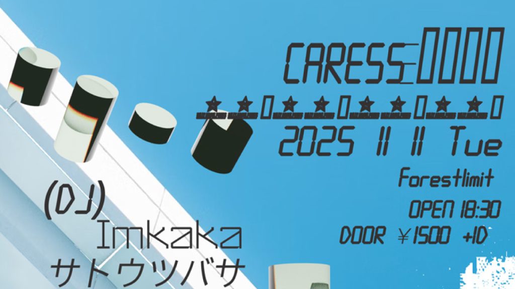 11/11 幡ヶ谷FORESTLIMIT DJのmewetaが主宰するプロジェクト・CARESSによるパーティが、2025年11月11日(火)に幡ヶ谷FORESTLIMIMTで開催。フライヤーはSSWの倫瑠が手がけた。 ディープリスニングパーティ”ideala”クローズ後のレギュラーパーティの一つを〈CARESS〉が担当中。その第3回目の開催となる今回は、キーワードとして11月11日という日付に「四つ打ち」のリズムを見出したラインナップとなっている。 LIVEとして、大阪よりエレクトロニカを基調にベッドルームとダンスフロアの間を浮動するような音像を作り出すMetome、イタリアのPHOBHO RECORDSからオブスキュアなEPをリリース、直近では歌モノのリリースも重ねるotaco、ダンスミュージックへの理解に基づいた骨太さと情景をも思い起こさせるような抒情性をはらんだ繊細さを併せ持ち、アルバム『opposite mirrors』のリリースも話題を呼んだTelematic Visionsが出演。 DJとして、神戸よりレイヴィーとゲットーの狭間にキッチュさ隠し持つImkaka、シカゴハウスやディープハウスを基調にゲットーテックやバレアリックまで幅広い視座で選曲する増田優作、CARESS主宰・mewetaが出演する。また、追加アクトとしてPAやエンジニアとしても活躍し、サウンドシステムへの深い理解に基づいた幅広い選曲でフロアメイクするサトウツバサが札幌より出演。それに伴いオープン時間も変更となっている。 – 2025/11/11(Tue) CARESS ▯▯▯▯ at 幡ヶ谷FORESTLIMIT OPEN 18:30 DOOR ¥1500(+1D) LIVE Metome otaco Telematic Visions DJ Imkaka サトウツバサ 増田優作 meweta Flyer 倫瑠