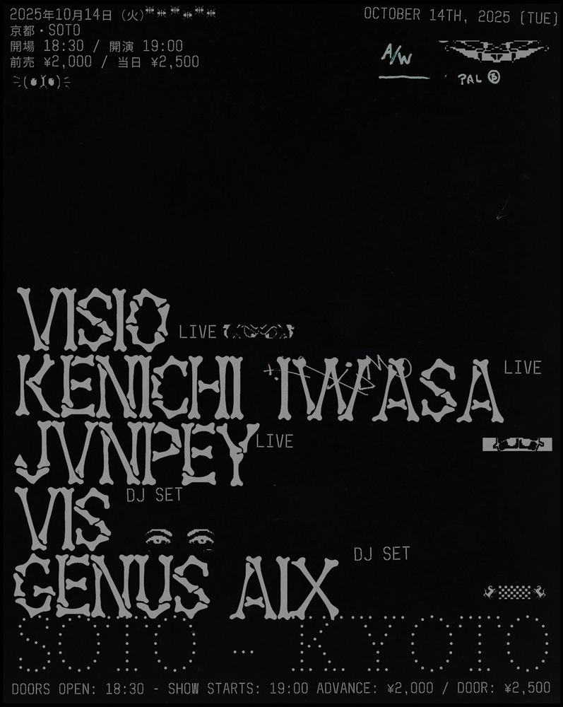 今回のジャパンツアーでは、日本各地の実験音楽/クラブシーンとの邂逅をテーマに、国内外の多彩なアーティストとの共演、そして新曲の初披露も予定されている。東京公演では、アーティストGünseli Yalcinkayaとの共作新曲の初披露に加え、MITHRILによる異世界的オーディオビジュアルセット、東京を拠点とするパフォーマー/DJのcityofbrokendollsとデジタルアーティストNYUによるコラボレーションも予定。また京都公演では、アルバム『Privacy Angels』でコラボレーションを行った英国在住の即興演奏家/映像作家Kenichi Iwasaが出演するほか、東京拠点のアーティストjvnpeyによるオーディオビジュアルセット、さらにベルリンから来日中のGenus AixによるDJセットもラインナップされている。VISIOの音楽と美術が融合する神秘的な世界観が、4都市を舞台に描き出される貴重なツアーとなる、とのこと。
