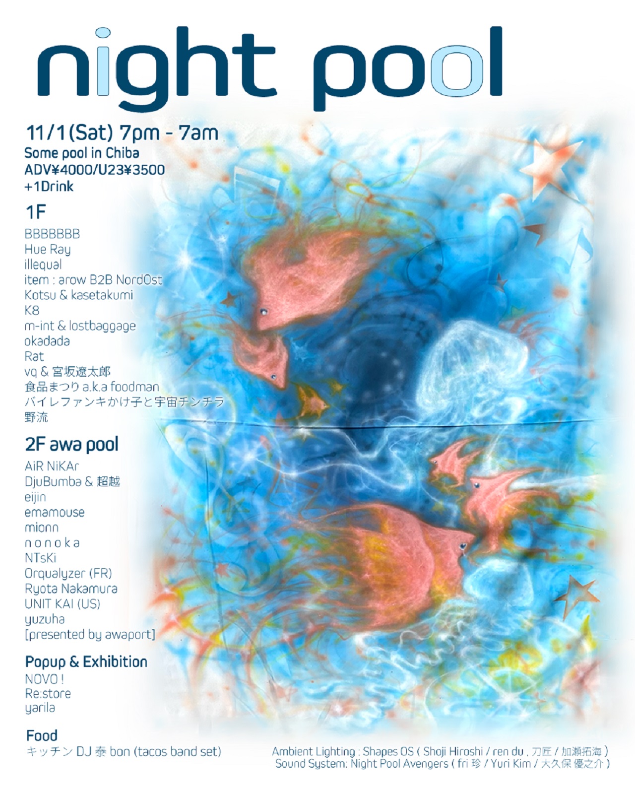 これまで複数回のシークレット・レイヴを発案、開催してきたDJ・宇宙チンチラが、11月1日(土)に千葉県某所の廃プールにてレイヴ「nightpool」を開催。1F・2Fの2フロア構成となり、2Fフロアはnonoka主宰レーベル〈awaport〉がキュレーションを手掛けた。フライヤーデザインもnonokaが担当。