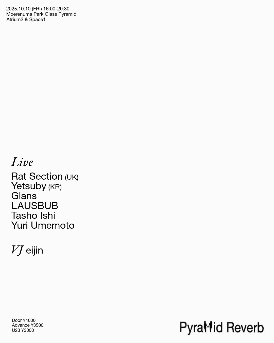 ライブアクトには、UKから、ダンスミュージックを軸に映像や身体表現などの視覚表現を交え、新たなライブスタイルを構築するミステリアスなユニットRat section。韓国からは、アンビエントユニットSalamandaのメンバーであり、高速なベースミュージックから広がるアンビエンスまでを自由自在に操るYetsuby。東京からは、クラブ的な手法を踏まえつつ、ダンスフロアに留まらないスケール感の表現でサウンドを鳴らすTasho Ishi。現代音楽のフォーマットに日本の二次元カルチャーを融合させ、クラブカルチャーとも密接なヨーロッパのオルタナティブシーンとも共鳴するYuri Umemoto。札幌からは、J-popの大衆さを汲みながらも、海外インディの実験的なポップスやフットワークなどのダンサブルなサウンドを融合させたサウンドを奏でるユニットLAUSBUB。そして、オルタナティブロックを核とし札幌のクラブカルチャーとも強く結びつくミニマルテクノ、アンビエントのようなサウンドを身に纏うバンドGlansが参加。