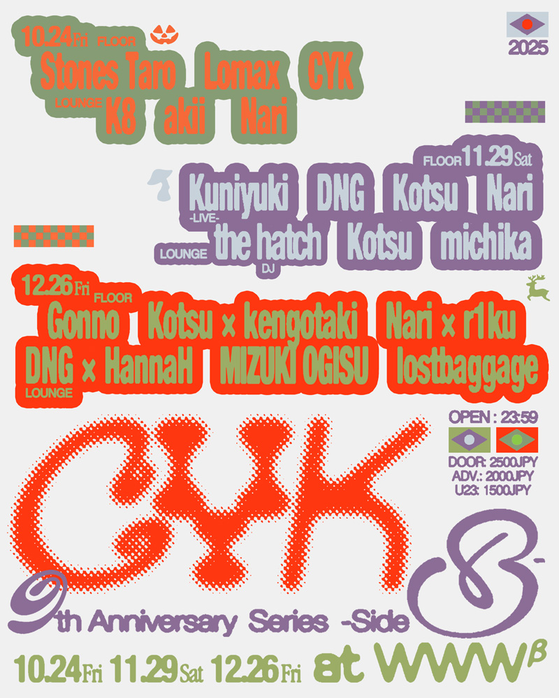 加えて12月には、CYKのKostu、NariとB2Bを披露してくれるkengotakiとr1ku(from FULLHOUSE)といった戦友とも呼べる両名が、パーティーへの助力を引き受けてくれた。また、パーティーの入口となるラウンジには、9年間の活動を通してCYKのメンバーそれぞれと関わりを持ってきた友人たちが登場する。それぞれの音楽への偏愛や培われた文脈/関係性を武器に、フロアとの対比や補完を繰り広げる、フレッシュでいて濃厚な社交の場となるだろう。