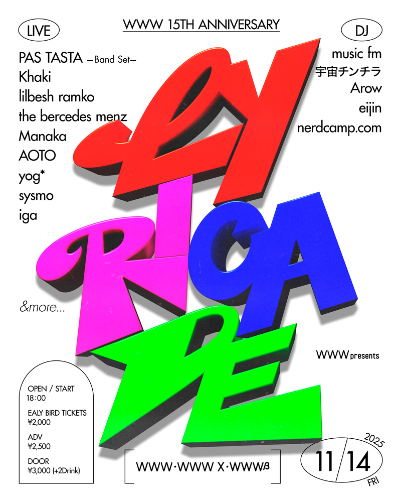 “LYRICADE”はジャンルを越えた表現者が集まり、ユース世代による多彩なシーンの”今”を提示する場をコンセプトに、PAS TASTA (Band Set)、Khaki、lilbesh ramko、the bercedes menz、AOTO、eijinらが出演。バンド、ラッパー、シンガー、DJまで幅広いアーティストが揃い、この日だけのラインナップで夜を彩る、とのこと。追加出演者も順次発表予定。