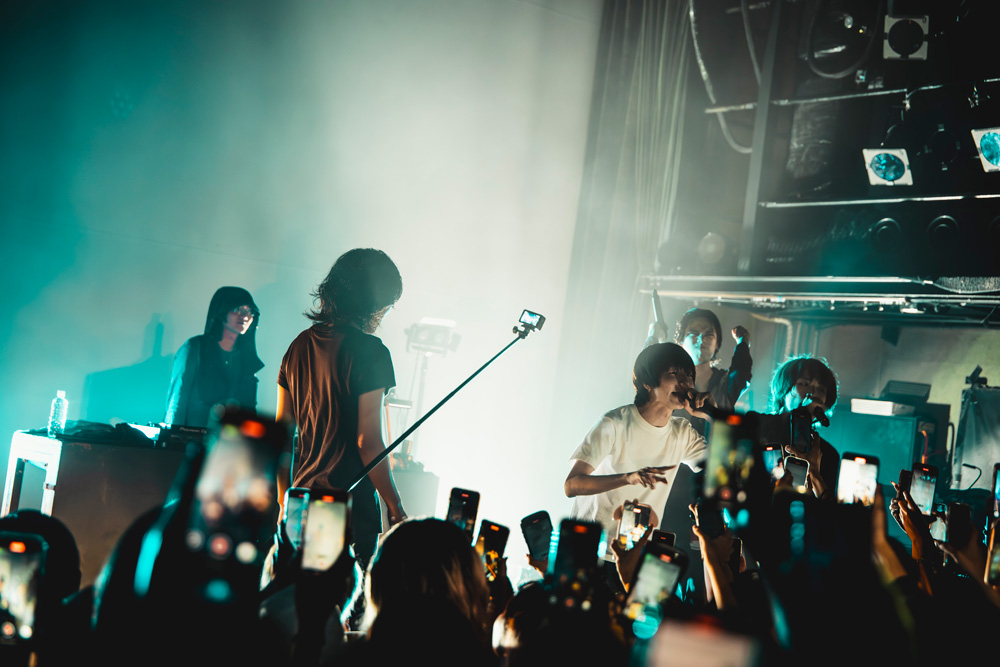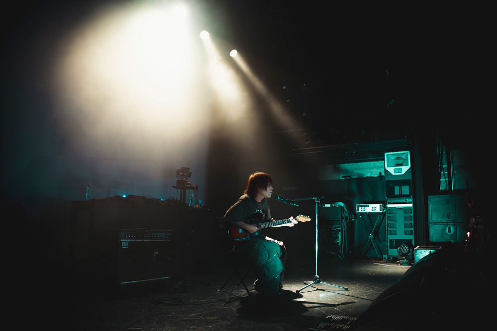 同じく3rdアルバム収録の「miyamoto634」、過去作から「僵屍」「cure」が披露され、言葉少なにMCを挟み第2パートへ。フロアの観客は騒いで盛り上がるよりも固唾を呑んで見守るような楽しみ方をしている人が多く、個人的にはそうしてじっと見守るシャイな人たちに共感するし、そんな人たちの心を徐々に解放していくのもワンマンの醍醐味で、アーティストの腕の見せどころだと思っている。