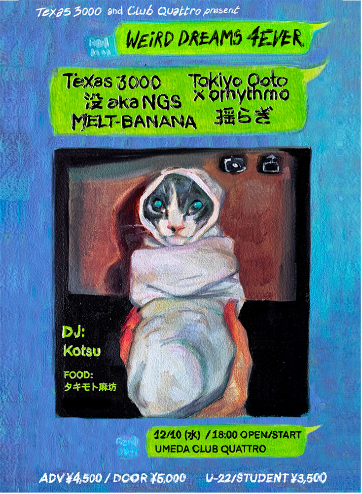 12/10 梅田クラブクアトロ 梅田クラブクアトロにて2025年12月10日にTexas 3000 and CLUB QUATTRO presents 「WEIRD DREAMS 4EVER」を開催。 今年4月、渋谷クラブクアトロで1夜限りの夢の狂乱を実現させたWEIRD DREAMSが今度は大阪・梅田クラブクアトロにやってくる。来年武道館公演を控えるGEZANの全国ツアー九州編の帯同や、中国エモ/マスロックの最高峰とも呼び声高いChinese Footballと中国での共演もアナウンスされ、全国各地のローカル/シーンを自由に飛び回るTexas 3000が次に目指す悪夢とは…? 今回第一弾解禁として「MELT-BANANA」「揺らぎ」「没 aka NGS」の3組の出演が発表。エレクトロでノイジーでパンキッシュ唯一無二の音像を世界 中で鳴らしているMELT-BANANA。轟音の海を飛び出しミ ニマルなバンドのアンサンブルが幾層にも押し寄せるダイナミクスを奏でる揺らぎ。国内外あらゆる地下通路を掘り進め、 スーパーフラットに身体的かつ実験的なギリギリのバランス を揺れ続けるラッパー没 aka NGSがTexas 3000が想起する悪夢に加わる。チケットの予約受付も9/30(火)18:00よりスタート。 「WEIRD DREAMS 4EVER を 12/10 (水) 梅田クラブクアトロでやります!美しさとカオスと優しさと鋭いノイズが交差するひねくれたミックステープみたいな最高のライナップを楽しめます。さらにわたしたちTexas 3000がいつも以上にクレイジーな演奏を期待して大阪へ絶対に来てくれ! 」――Texas 3000 【Texas 3000 and CLUB QUATTRO presents「WEIRD DREAMS 4EVER」】 ◆Dates:2025年12月10日 (水) OPEN / START 18:00 ◆Acts: Texas 3000 / MELT-BANANA / 没 aka NGS / 揺らぎ and more… ◆Tickets:ADV:一般 4,500円 U-22・STUDENTS 3,500円(税込/スタンディング/整理番号付/ドリンク代別) ※U-22/STUDENTSの対象者は公演当日2025.12.10時点で22歳以下の方、もしくは年齢にかかわらず学生の方です。 ※ID/身分証の確認ができない場合、当日差額分をいただきます。STUDENTSは要学生証。 ※身分証明書は右記いずれかの写真付きのもの(学生証、運転免許証、パスポート、マイナンバーカード等) <クアトロWEB先行抽選>9月30日(火)18:00~10月5日(日)23:59 <Pre-order先行抽選>10月8日(水)18:00~10月19日(日)23:59 <一般先着>10月24日(金)12:00~ ◇お問い合わせ:梅田クラブクアトロ 06-6311-8111 ◇HP: