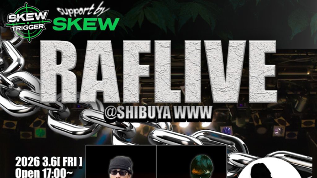 3/6 渋谷WWW Kamuiとポーザー白石によるTwitch配信「ラフスタ」が主催する「RAFLIVE」が、3月6日に渋谷WWWにて開催される。 11月に行われた前回のRAFLIVEでは即日SOLDOUTした人気企画で、今回もラフスタに関連するアーティストを中心に総勢8名のラッパーが集結した。 前回に引き続きの参加となるのがSiero, Jellyy, e5, Nia Varanの4名。加えてlilbesh ramko, Hezron, S.J soldierと直近ラフスタにも出演していたメンバーが新たに参加となった。UDG Cypherにて話題になったKiannaもラインナップに加わっている。 フライヤーのデザインはsigが配信上にてリアルタイムで制作。制作中に出演者が徐々にわかっていく仕掛けにて視聴者と盛り上がりを作り上げた。sigはDJとしての参加も決まっている。 またラフスタの配信上にて2名のSHOT LIVE枠の公募も行っている。詳細はラフスタのSNSをチェックして欲しい。 今回からはCBDベイプブランドの「skew(スキュー)」が協賛として参加。今後の情報に関してはラフスタのTwitchアカウントを確認して欲しいとのこと。 – RAFLIVE 2026年3月6日(金)東京都 渋谷WWW OPEN 17:00 / CLOSE 21:30 チケットリンク:https://eplus.jp/raflive/ <出演者> LIVE:Kamui / lilbesh ramko / Hezron / Siero / Jellyy / e5 / S.J soldier / Nia Varan / Kianna SHOT LIVE:ラフスタにて公募 DJ:Sig supported by skew
