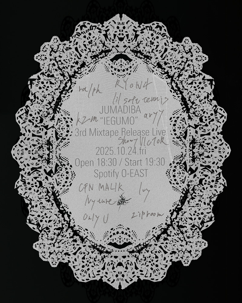 10/24 O-EASTでワンマンライブ開催 JUMADIBAが3rdミックステープ『IEGUMO』をリリース。全国11都市を巡るツアーを開催。高知を皮切りに、福岡、長野、富山、金沢、仙台、鹿児島、大阪、京都、名古屋、ファイナルは東京。ツアーファイナルは、東京・Spotify O-EASTにて3年ぶりとなるワンマンライブ開催。チケット先行抽選がスタート。ワンマンビジュアル、ツアービジュアルを担当したのは、ポスター、 ビジュアルなどのグラフィックデザインをはじめ、CDやブックデザインなども手がけている、八木幣二郎 / Heijiro Yagi によるもの。 明日20:00より、収録曲「Nah だ」のミュージックビデオが公開。ディレクターを務めたのは、「sakasama」、「paypay」、前シングル楽曲「神田川」などJUMADIBAの数々の作品を手掛けている Ryo Sudaによるもの。 仲間との共鳴を原動力に、自身のスタイルを深めながら進化を重ねてきた新作は、狭い部屋や擦れた生活音、日々の風景といった日常の断片から生まれた。家で流れる音楽や、友人たちとの何気ない会話がそのまま音となり、JUMADIBAひとりではなく“みんなで過ごした時間”が塊になったミックステープ。客演には盟友・Lil Soft TennisやShowyVICTORが参加。Gen Yamada、George Bolton、JD. Reid、Nathaniel London、Tuzeら国内外のプロデューサー陣に加え、JUMADIBA自身のプロデュース曲も収録された全14曲収録。限られた空間から放たれた言葉とビートは、時間も場所も越えて広がっていく。『IEGUMO』は、小さな日常から生まれた、大きな時間の塊。 風のように、雲のように、東京を滑るように進むJUMADIBAの“今”がここに刻まれている。とのこと。 IEGUMO – JUMADIBA 3rd MixTape Release LIVE 2025/10/24 FRI @ Spotify O-EAST OPEN 18:30 / STRAT 19:30 ▼オフィシャル先行受付 (抽選制) 7/9(水)19:00〜7/20(日)23:59 受付URL:https://w.pia.jp/t/jumadiba-t/ JUMADIBA – IEGUMO Release date : July 9 2025 Stream : https://linkco.re/bny0nFyA Tracklist 1. Nah だ (prod. Tuze) 2. Sasa feat. Lil Soft Tennis (prod. nerdwitchkomugichan) 3. Strawberry Sense (prod.