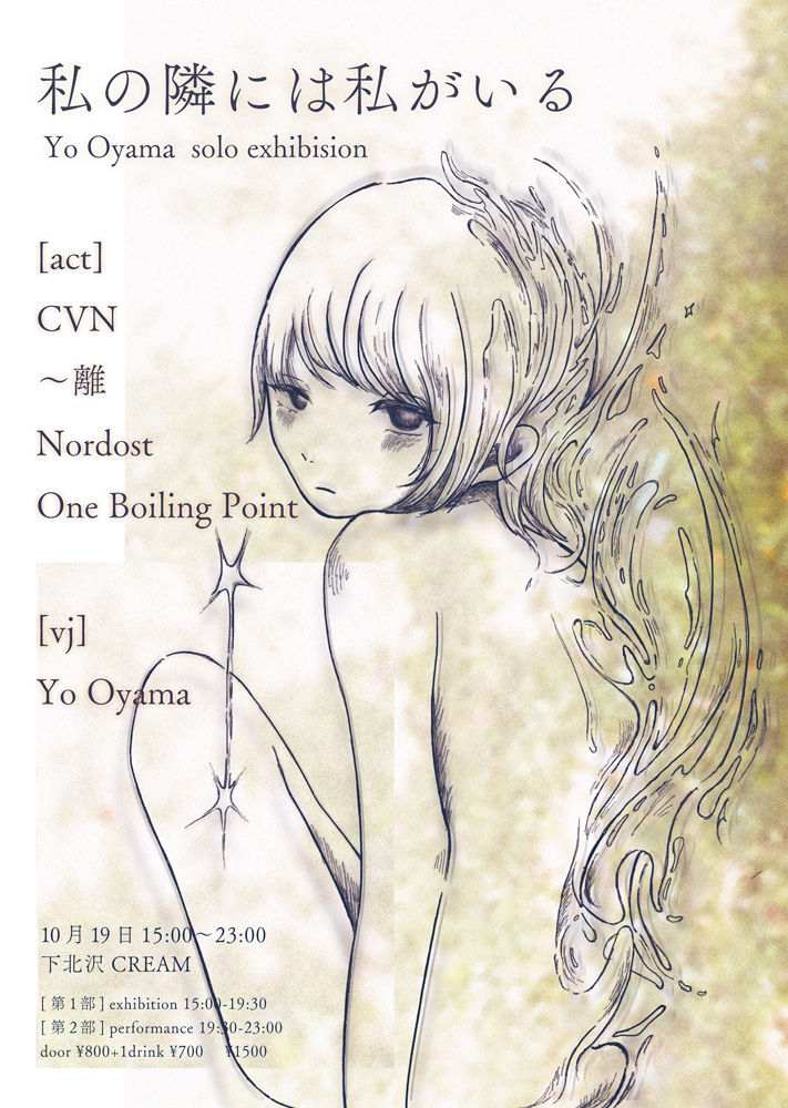 15:00〜19:30に行われる第1部では、B1Fの展示空間を舞台に、Yo Oyamaが日々制作を通じて向き合う“内側”の感覚をインスタレーションとして提示する。日常のなかで輪郭が曖昧になる自己を見つめ、幼い感覚や存在の質感を探るような視点から、「私の隣にはいまの私がいる」という認識を形にすることを目指す。