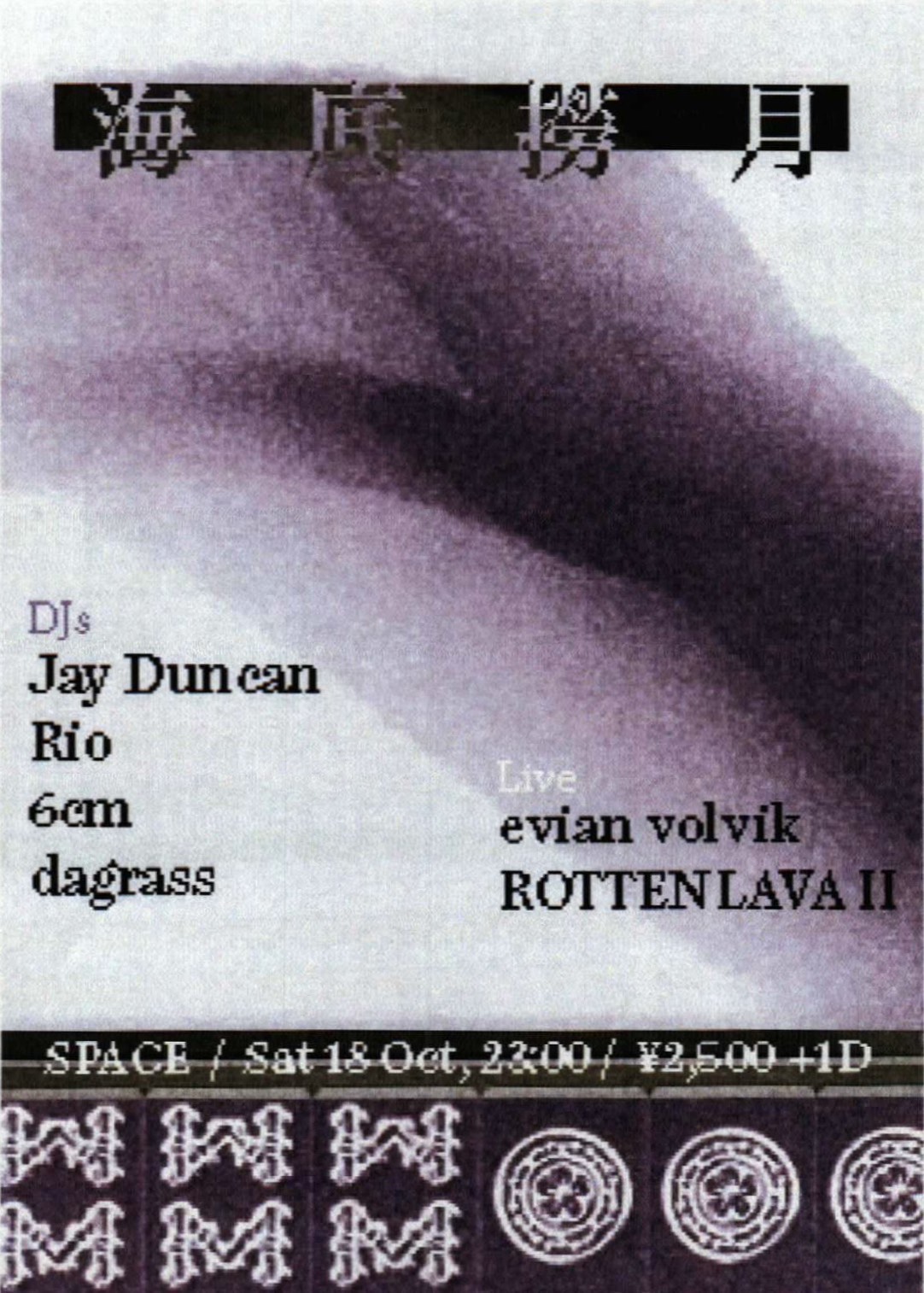 記念すべき第一回目にはUKのTrule、Baroque Sunburst等から好リリースを重ねるUKダブテクノ期待の新星Jay DuncanをゲストDJとして迎える。Rio(from Homie Homicide)、6cm、dagrass、ライブアクトとしてevian volvik、主催のROTTENLAVA Ⅱが出演。