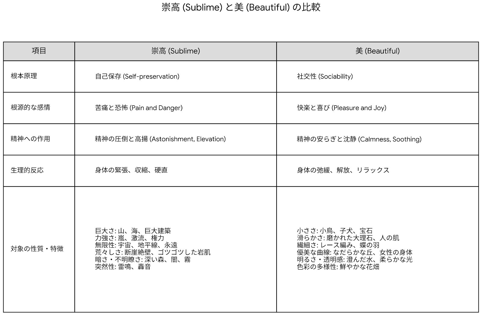 ではその驚き、独創性の理論的源泉とはなにか。あえて古い美学の概念に引き寄せて述べれば、それは鑑賞者の感じる「崇高さ(Sublime)」ということになるだろう。エドマンド・バーグは『崇高と美の起源』(初版:1757)において「崇高」を「美」に対応する概念として極めて包括的に理論化している。本書で紹介される崇高の条件を美のそれと比較してみると下図のようになる。
