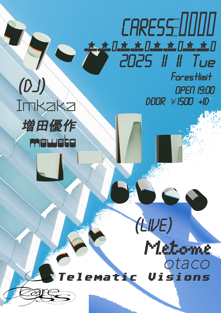 DJのmewetaが主宰するプロジェクト・CARESSによるパーティが、2025年11月11日(火)に幡ヶ谷FORESTLIMIMTで開催。フライヤーはSSWの倫瑠が手がけた。