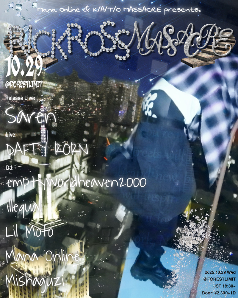 先日キャリア初となるEP 『RICK ROSS』をリリースしたラッパーSarenが、Mana OnlineとK/A/T/O MASSACREの協力のもとリリースパーティを10月29日に幡ヶ谷Forestlimitにて開催。