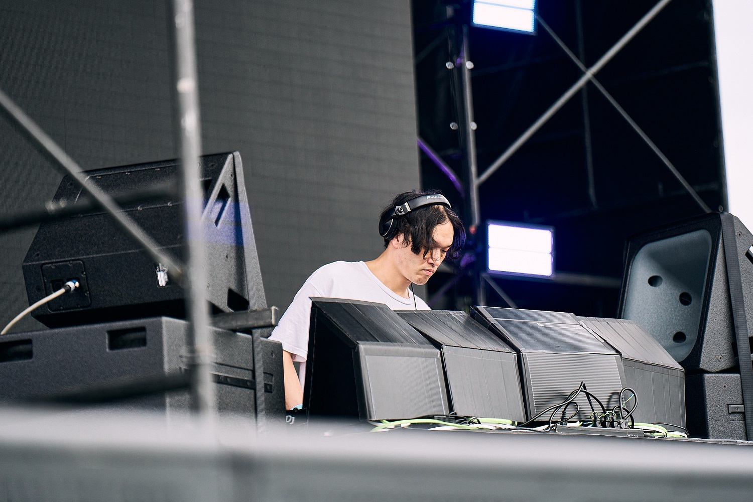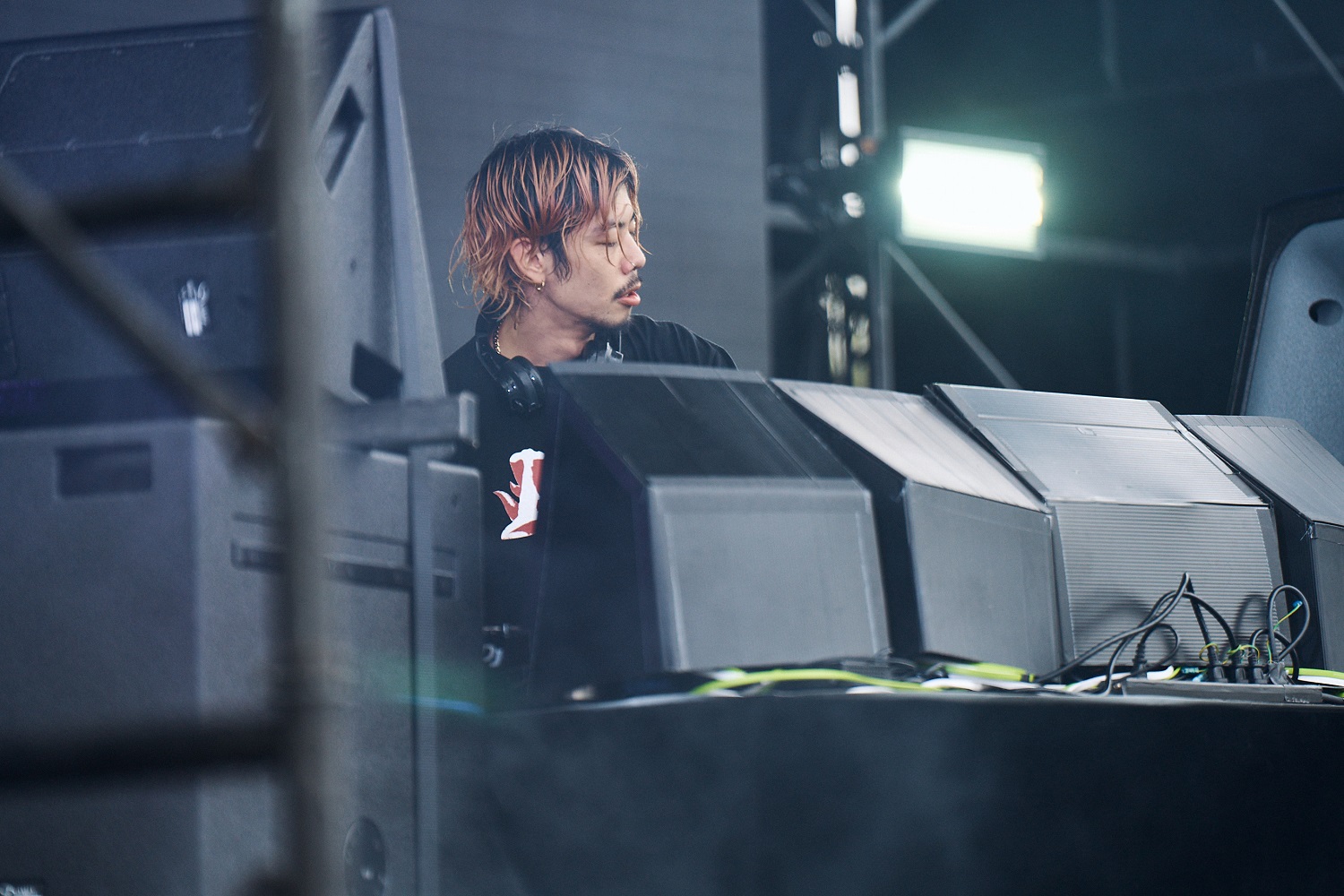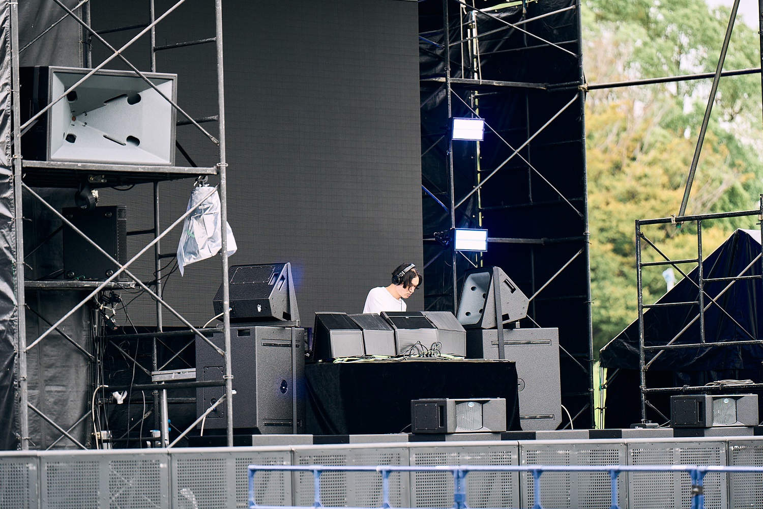全国各地のさまざまなロケーションで活躍する彼の今回のセットは、今年リリースされたミニアルバム『生活*1』を基調とした内容。野外フェスという環境、クラブ寄りのシチュエーションにも合致していた。1曲目の「Porsche/暮れ」からほどなくして、曇り空を飛行機が横切り、雨が降りはじめる。エンジン音とベース、ハイハットがクロスして轟音となり、悪天候を跳ね除けるようなエネルギーを発していた。ハイエナジーなだけでなく、肩の力を抜いてリラックスしていこうと観客に提案するようなアプローチも光る。いつ何度観ても素晴らしいし、あれだけの活動ペースでありながら引き出しが尽きることはない印象。アーティスティックでありつつも、サービス精神にあふれている。