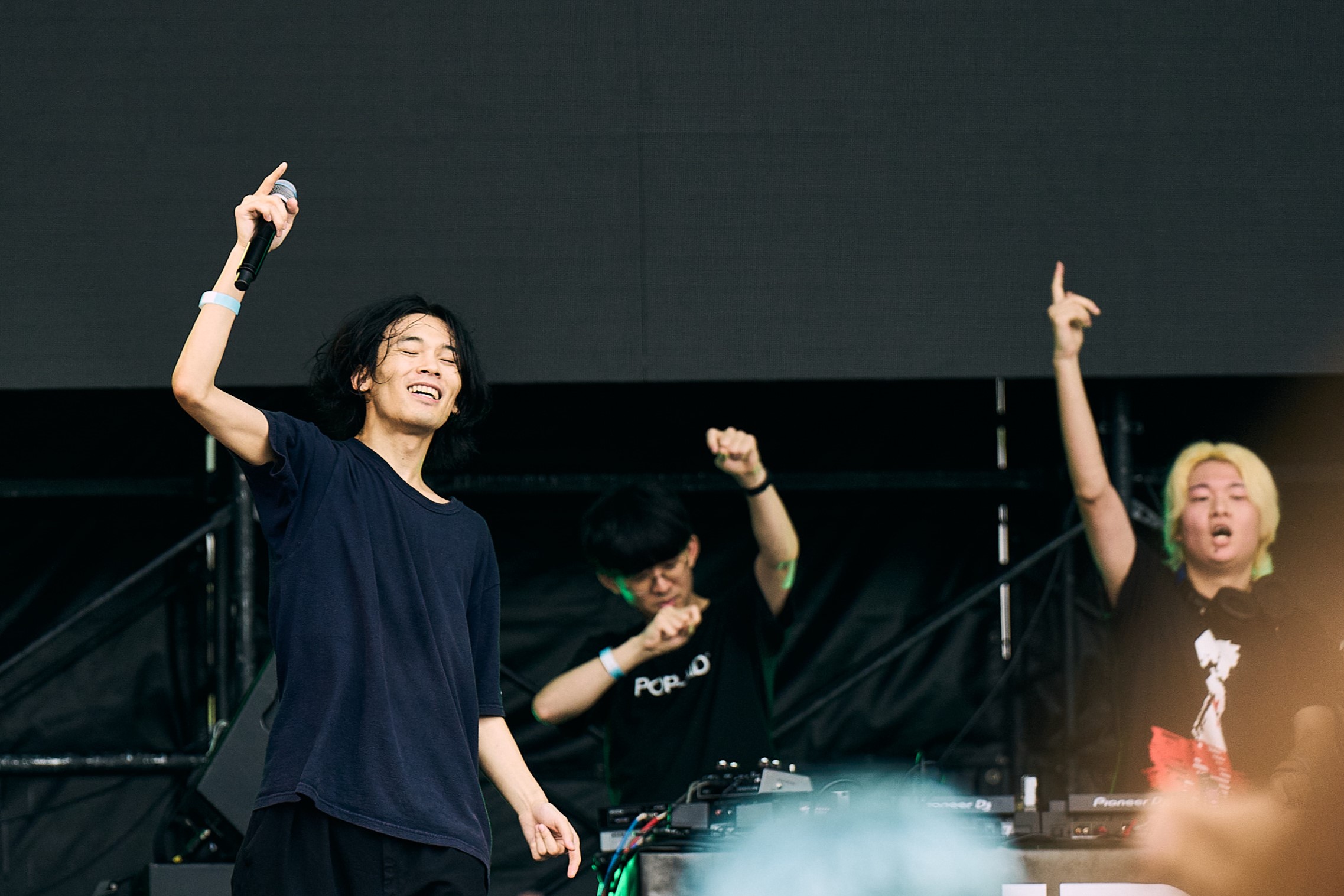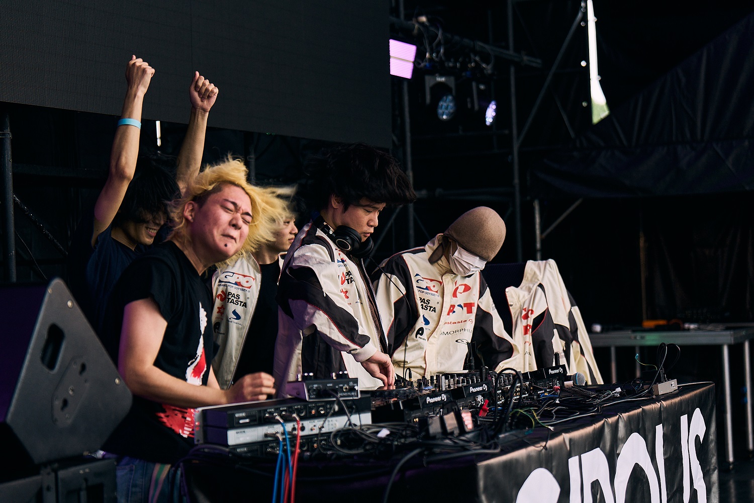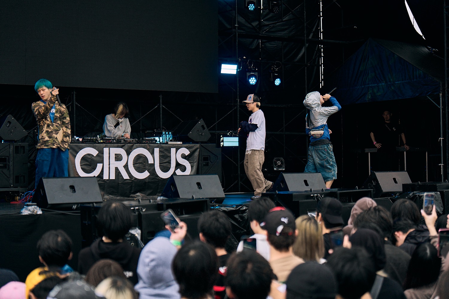 メンバー各々のスタンスを表明するかのようなDJパートからライブに移行し、ウ山あまねがマイクを握る。それにしても、この日のPAS TASTAの勢いと観客の期待感は凄まじかった。1st、2ndの収録曲からアンセムが次々と披露され、フロアの熱は高まり続けていく。生憎の空模様を跳ね除けるように盛り上がる様子は、まさしく野外フェスのそれだろう。