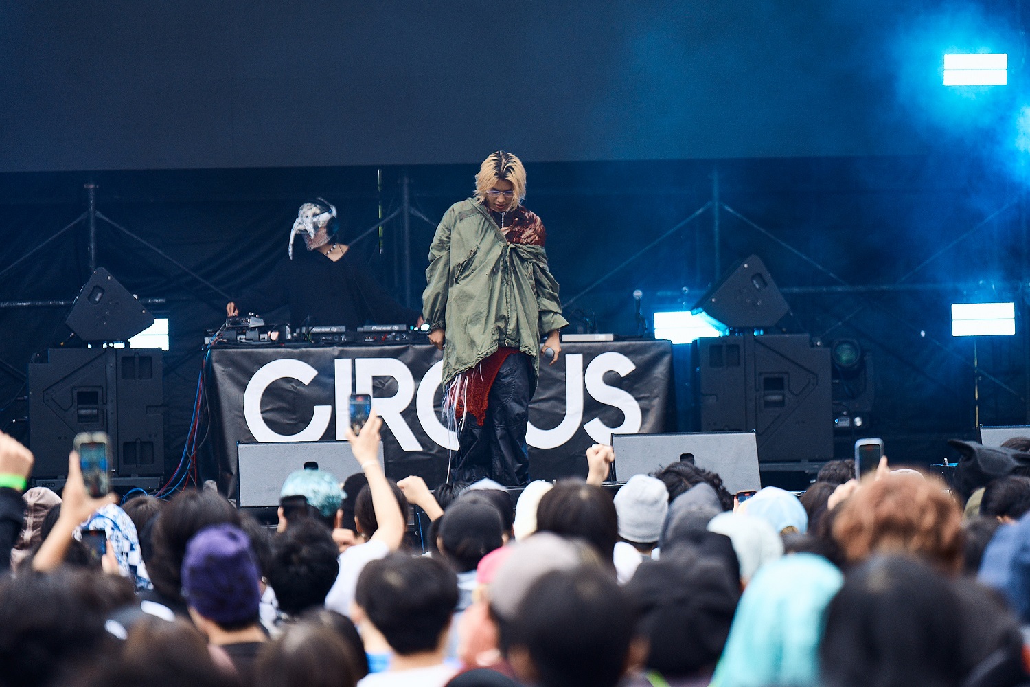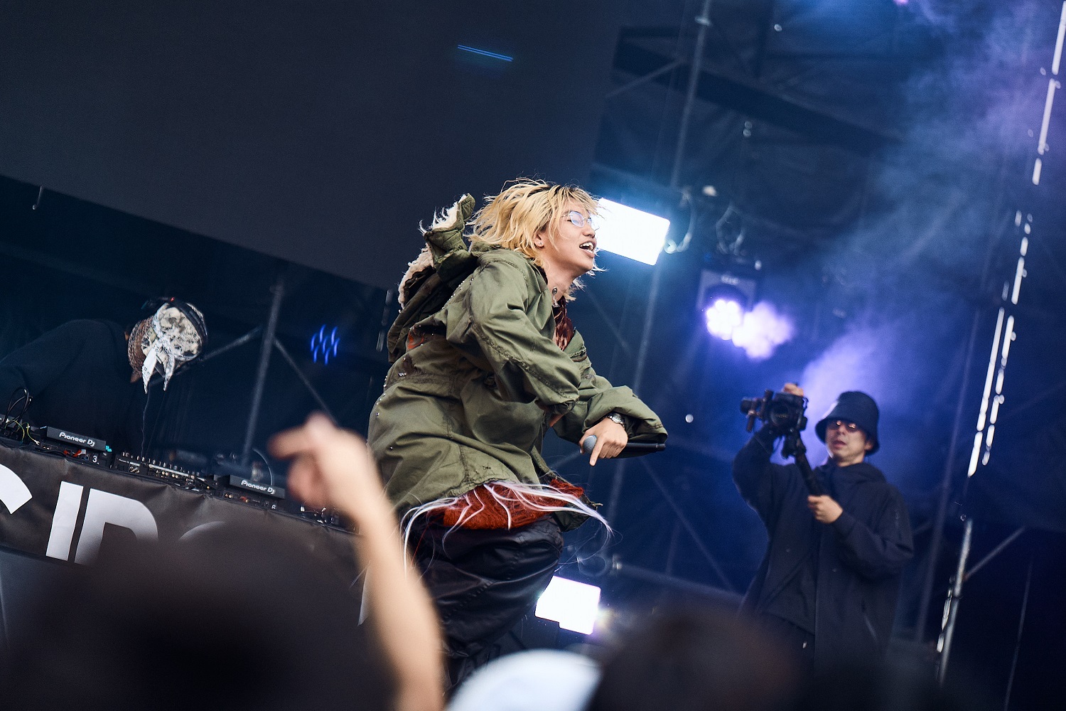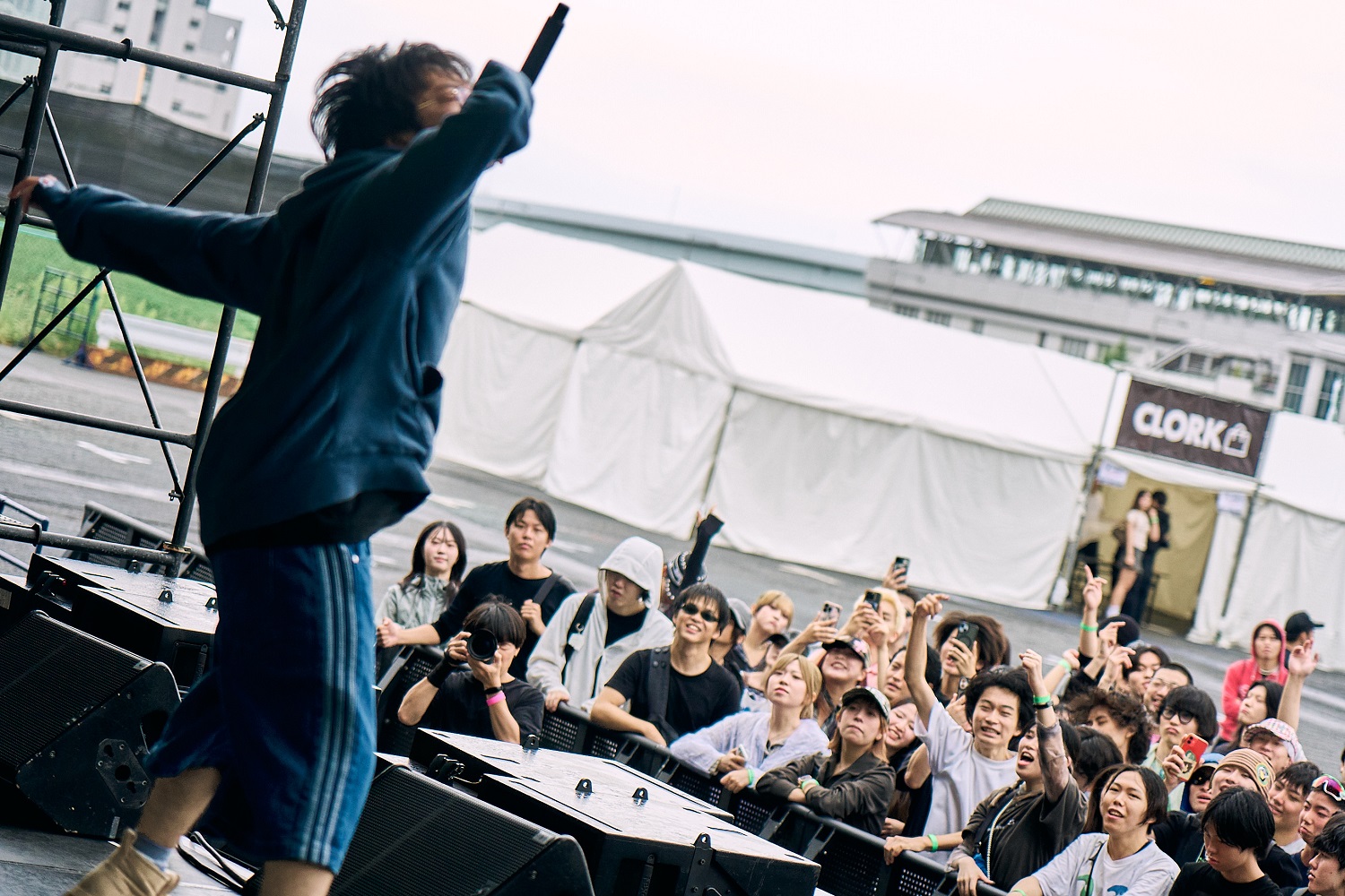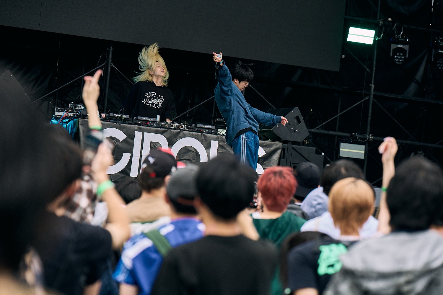 メンバー各々のスタンスを表明するかのようなDJパートからライブに移行し、ウ山あまねがマイクを握る。それにしても、この日のPAS TASTAの勢いと観客の期待感は凄まじかった。1st、2ndの収録曲からアンセムが次々と披露され、フロアの熱は高まり続けていく。生憎の空模様を跳ね除けるように盛り上がる様子は、まさしく野外フェスのそれだろう。