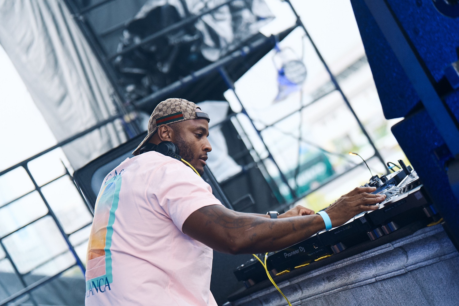 けれど、ステージに来てみるとBPM140以下ぐらいのブレイクビーツがかかっていて意表を突かれた。そこからレゲエ・サンプリングの大バンガー、Mark V. & Poogie Bear「Da Boy Is Bangin」(1991)がプレイされて驚いた。最近のUKダンス・ミュージックに初期のブレイクビーツを混ぜてる感じだろうか。うっすらUK Funkyぽいけどキックの重心が絶妙な四つ打ちなどもミックスされていた。それでもハットのドラムマシン感やスネアのサンプルが、ちょっと昔っぽくてかっこいい。野外だからか、サウンドシステムが良いのか、クラシックスと最近の曲を混ぜているのにかなり今っぽい音像で聴けた。