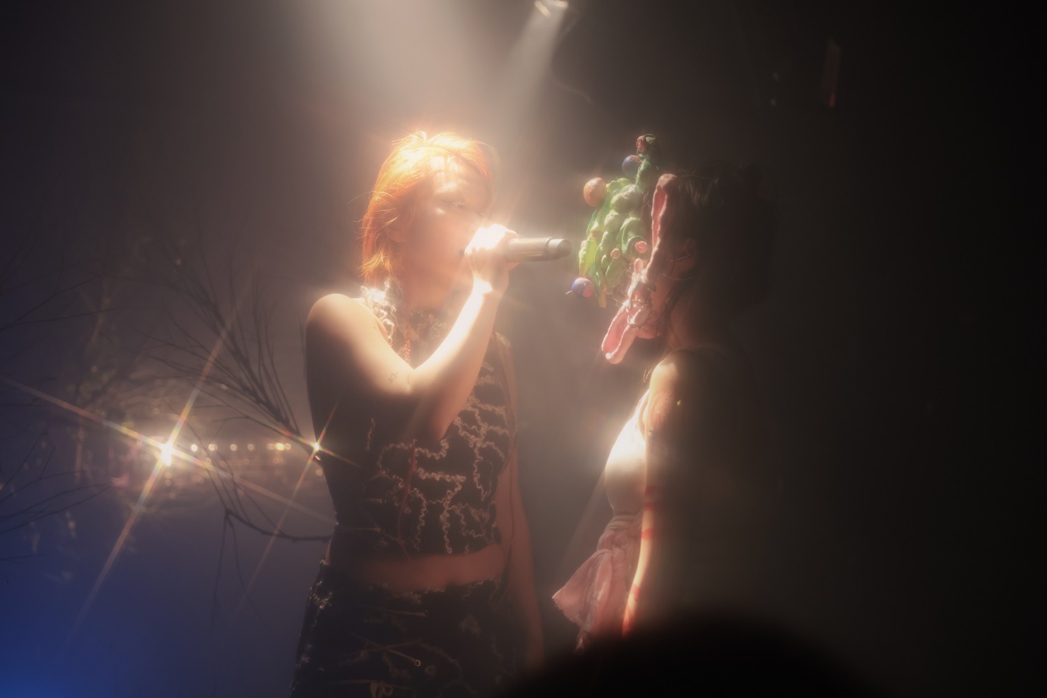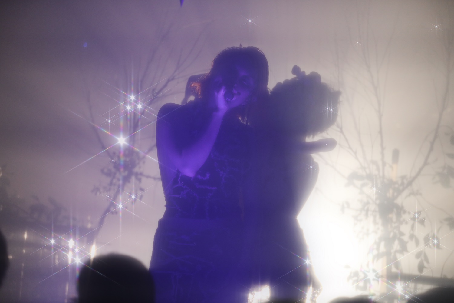展開が進むにつれ、NTsKiのユーフォリックな声色が深くリバーブの効いたマイクを媒介に会場へ溶け出す。その過程で声の倍音成分だろうか、イヤホンを通した聴取ではけっして感じられない艶と厚みが広がっていく。CIRCUS TOKYOの売りといえばVOID Acoustics製のパワフルなサウンドシステムだが、こうした力強いクラブ的な音響が繊細さを伴う公演の美しさを補強していたように思える。ライブハウスではなく、クラブやレイヴに軸足を置く彼女ならではの聴取環境へのこだわりが伝わってきた。