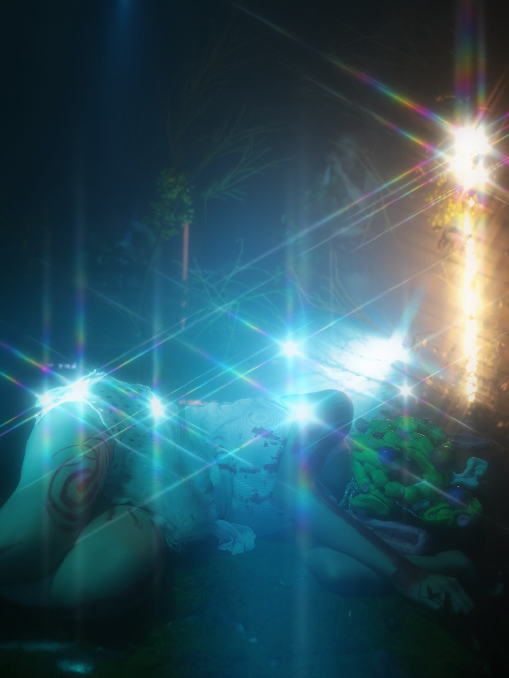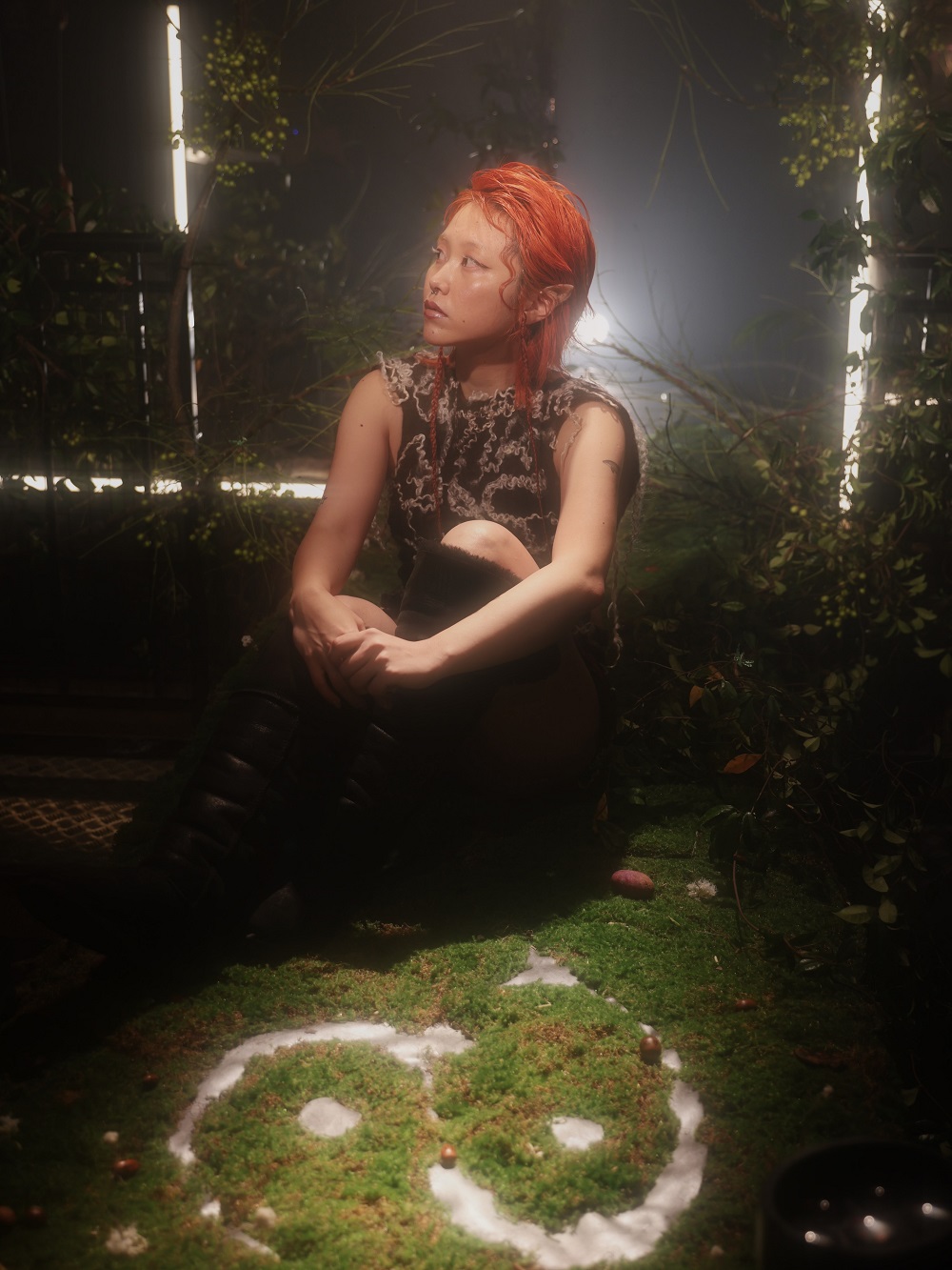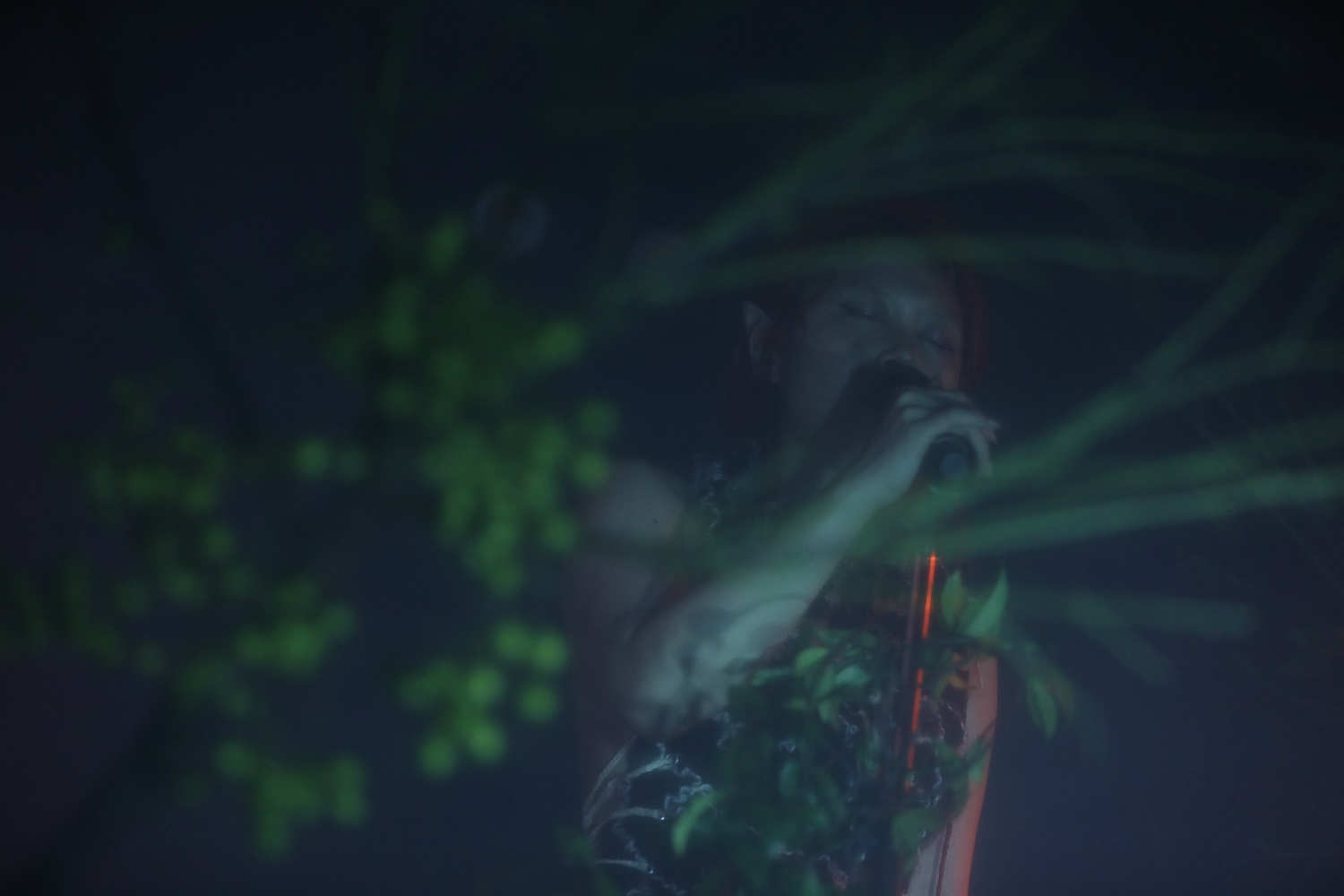 虹賀がサーチライトのように照らしていくうちに、本日の舞台があらわになっていく。普段の無機質なクラブのステージには芝生や植物が随所に張り巡らされており、森林の奥に広がる湖畔をたまたま訪れたような錯覚を覚えた。