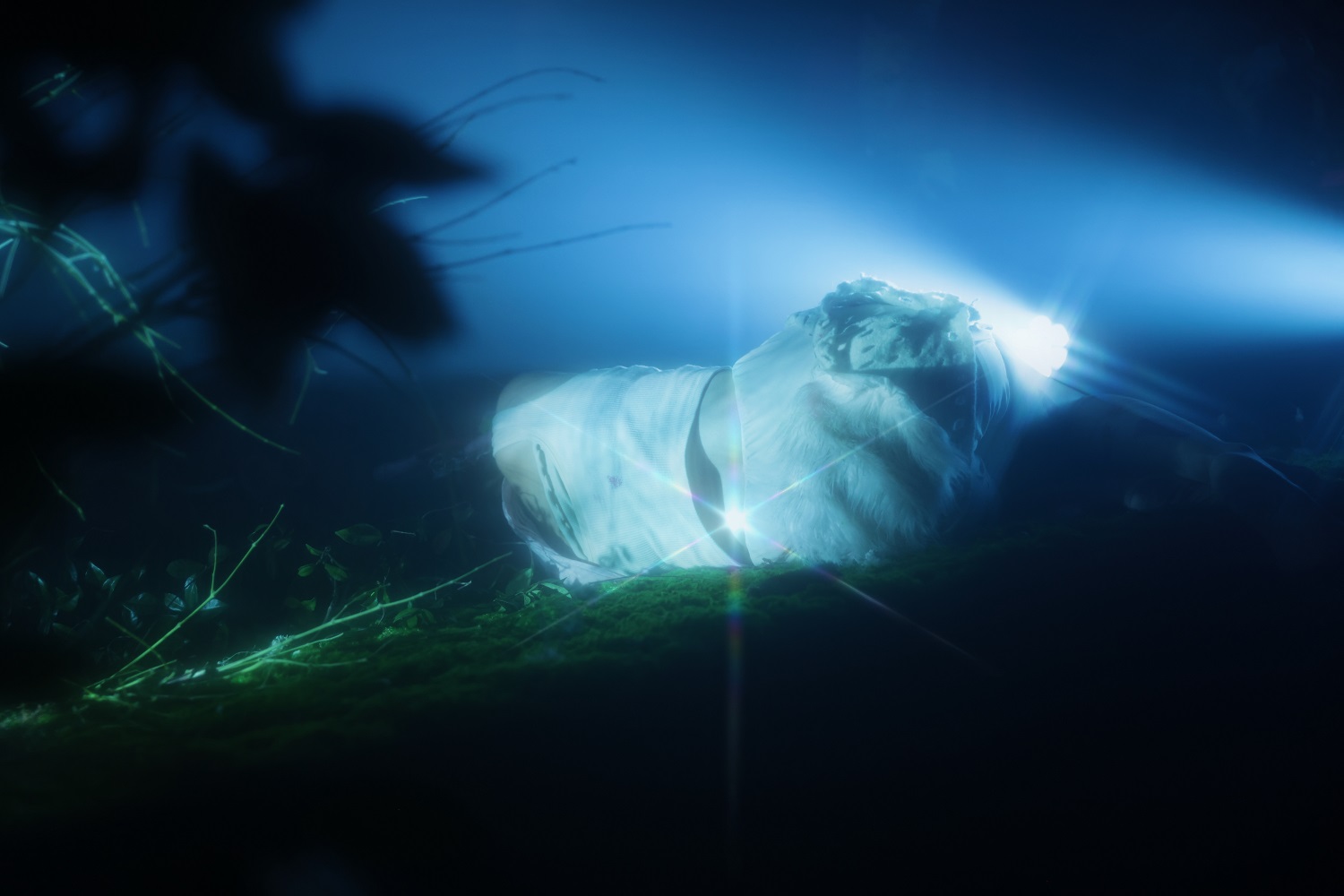 ほどなくして登場したのは身体表現者・田村虹賀。NTsKiの棲む森を訪れた精霊のような佇まいで、フロアの暗がりを懐中電灯で照らしてみたり、ステージに広がる草原で眠ってみたり、歌い上げるNTsKiと向き合ってみたりと自由闊達に動き回り、ダンスの枠組みの外側へ飛び出すようなパフォーマンスでライブを彩った。
