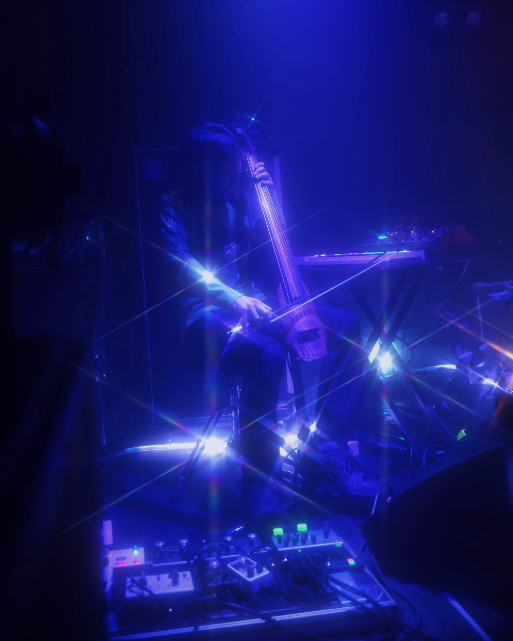 ラウンジからフロアへ降りると鈴の音か鐘の音か、か細くも芯のある音色が耳に入ってくる。観客の階段を駆け下りる音や息づかいが加わり、サウンドスケープが広がっていく。鐘の音を鳴らしていたのはNTsKi本人。環境音から、気づけばリリース・ライブが始まっていた。シームレスな演出に唸りつつ、照明の落とされたフロアの暗がりのなかで没入感に浸る。しかし張り詰めた緊張感はなく、空気が澄んでいくような、研ぎ澄まされていく感覚があった。抜群のセッティングだ。