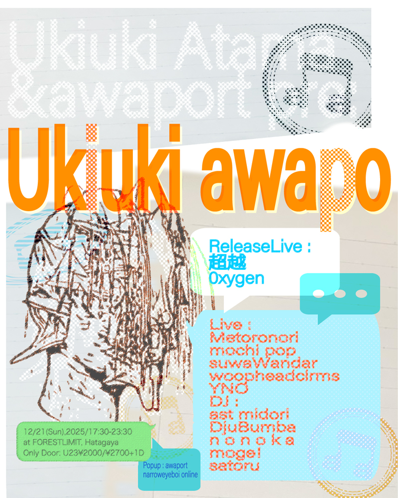 愛知拠点の電子音楽家・woopheadclrms主催のレーベルUkiuki Atamaと、東京を拠点に新しいポップを定義するレーベルawaportが、幡ヶ谷FORESTLIMITにて共同イベント「Ukiuki awapo」を共催。