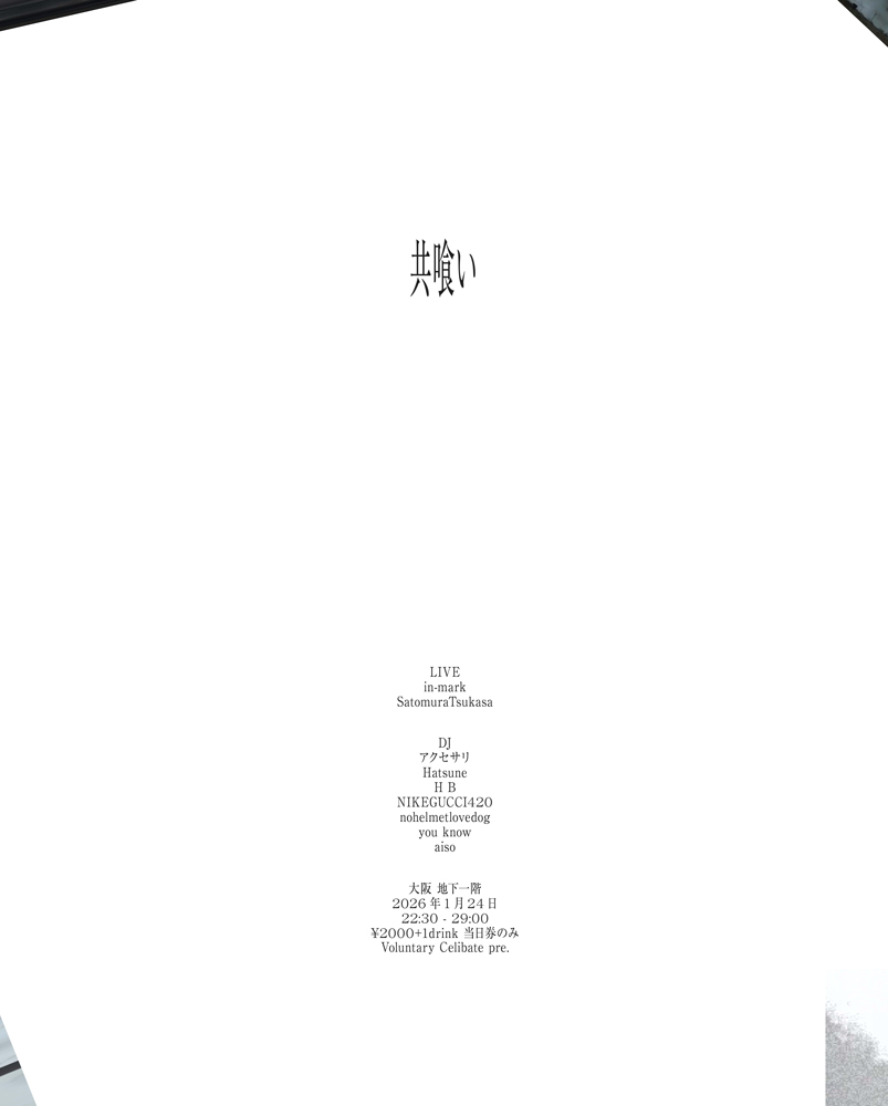 関西を拠点に活動するaisoとdjyeezyboost350v2によるユニット”Voluntary Celibate”による初の主催パーティー「共喰い」が大阪・地下一階にてオールナイトで開催。