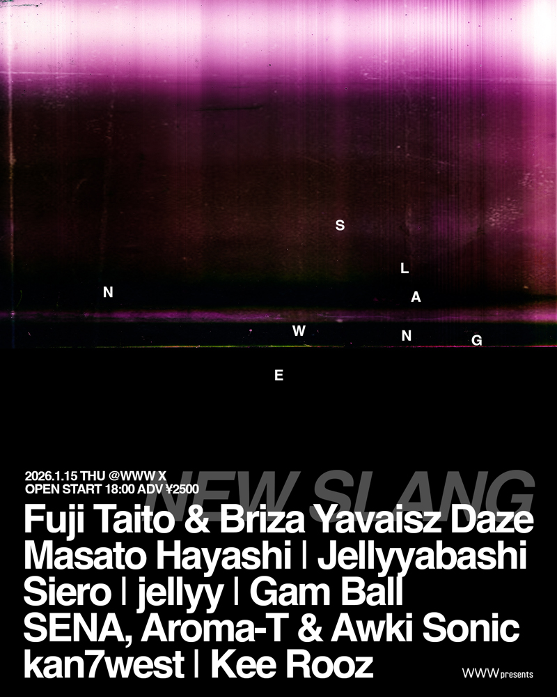 2026.1.16 WWW X 全国各所のライブ現場のみならず、インターネットも含め脈動する才能をフックアップし、多様な表現を体感する新企画〈WWW presents NEW SLANG〉が2026年1月15日(水)に渋谷・WWW Xにて急遽開催決定。 第一回となる今回には、Fuji TaitoがクルーのBriza Yavaisz Daze (Sawaki, Kensei, Lil kaviar)と共に登場。また先日の〈RAPSTAR 2025〉でも鮮烈な存在感が話題を呼んだばかりのMasato Hayashi、横須賀を拠点にするクルー〈YOKOSQUAD〉にて活動し、ミックステープ『Demo tape vol.1』が注目を集めたJellyyabashi、脱力感に満ちたフロウが異彩を放つ新潟のラッパー・Gam Ball、インターネットからシーンに新風を巻き起こしているSieroとjellyyが出演。 さらには山梨から注目の新星SENA、Awki Sonic兄弟とAroma-Tがユニット形態で登場。水面下で注目を集めるアップカミングな面々が一堂に会する日となる。オープニングDJは都内のクラブを中心にフロア各所を沸かすDJクルー・kan7westが担当。チケットは只今よりe+にて販売開始、未成年も入場可能とのこと。 WWW presents NEW SLANG 日程:2026年1月15日(木) 時間:OPEN|START 18:00 会場:WWW X 出演:Fuji Taito & Briza Yavaisz Daze|Jellyyabashi|Siero|jellyy|Gam Ball|SENA, Aroma-T & Awki Sonic|kan7west & more 前売:¥2,500(税込 / オールスタンディング / ドリンク代別) チケット:e+ イープラス:https://eplus.jp/new-slang/ ※未成年入場可能