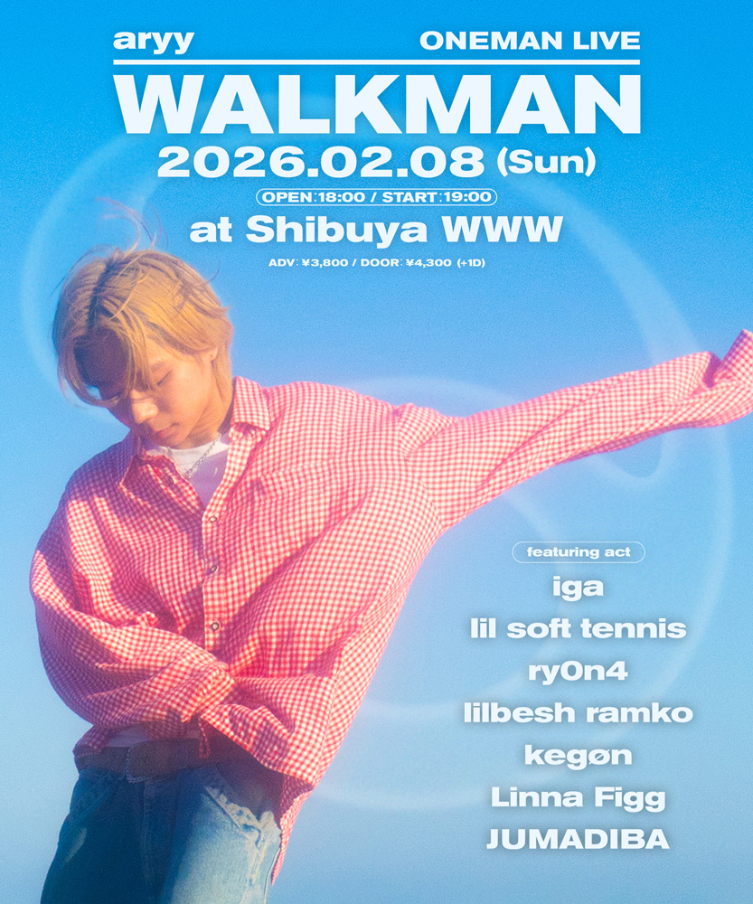 バンドセットを含む構成で、客演の参加も予定 2ndアルバム『WALKMAN』を11月19日にリリースするaryyが、キャリア初となるワンマンライブを2026年2月8日(日)に渋谷WWWで開催。 ベッドルーム・ロックを提唱し、日常の延長にあるリアルな感情や景色を描き出してきたaryy。今回の公演では、『WALKMAN』収録曲を中心に、これまでの歩みとこれからのビジョンをつなぐようなライブを予定している。バンドセットを含む構成で、客演アーティストの参加も予定。作品としての表現と、ステージ上の生々しい熱量が交差する一夜とのこと。チケットは本日11月12日(水) 19:00より抽選先行開始。 aryy ONEMAN LIVE -WALKMAN- 2026年2月8日(日)at Shibuya WWW ADV:¥3,800 / DOOR:¥4,300 (税込/スタンディング/ドリンク代別) OPEN:18:00 / START:19:00 チケット: https://eplus.jp/sf/sys/comingsoon.html 抽選先行:11/12(水) 19:00~11/16(日) 23:59 一般発売:11/21(金) 12:00 INFO:WWW 03-5458-7685 aryy – WALKMAN Release date : November 19. 2025 Stream : https://orcd.co/aryywalkman Tracklist 1. ビートルズ 2. GTA 3. Playback 4. BEACHBOYS INTERLUDE 5. 海にいこう!! 6. T-rex feat iga 7. Seoul 8. 宇宙人 9. CRY(if you feel so)
