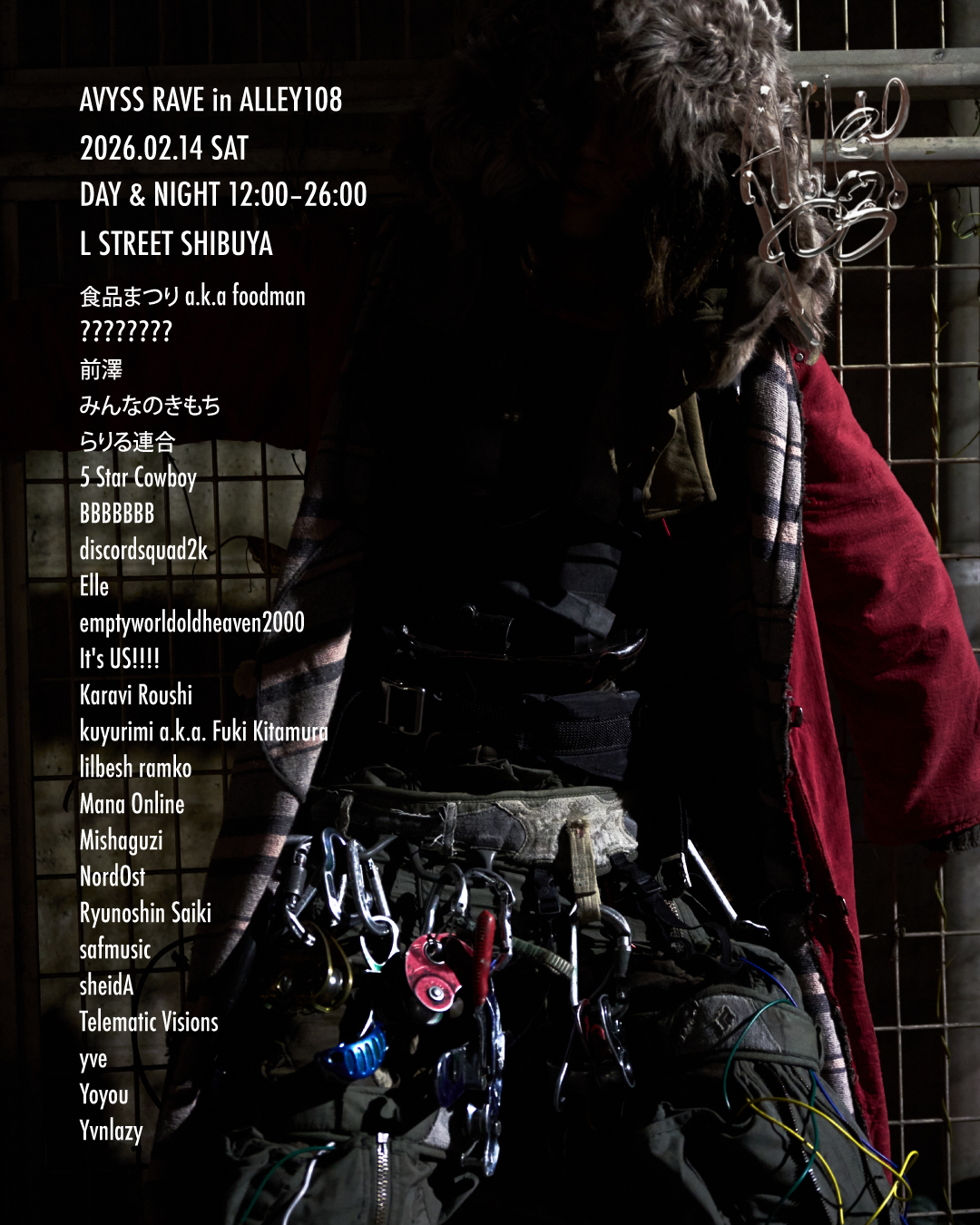 2/13(金) 渋谷から新木場へ座標を再設定 2026年2月13日(金)〜15日(日)の3日間、渋谷センター街の路地・Lストリートを舞台に、DIG SHIBUYA 2026 公式採択プログラムとして開催される没入型レイヴ&アートプロジェクト「ALLEY108」。 当初はライブやDJなどの音楽プログラムも同会場での実施を予定していたが(前回アナウンスの詳細)、諸事情により音楽プログラムのみ会場を新木場・Studio Flammehへと移し、2月13日(金)に「AVYSS RAVE」と「ISCARIOT ᭦ (ding)」が合流して開催されることとなった。 これに伴い、新会場での開催に向けた各種チケットの販売が開始。 AVYSS RAVE + ISCARIOT ᭦ (ding) in ALLEY108 日時:2026年2月13日(金) 会場:新木場 Studio Flamme OPEN 17:30 / CLOSE 5:00 TICKET:https://livepocket.jp/e/qbjjy DAY & NIGHT 2500円 ※20歳未満入場・購入不可 DAY: 1,000円 <22:00迄> NIGHT: 1,500円 <22:00以降> ※再入場不可/ 顔写真付き本人確認あり DJ / LIVE (A to Z) 食品まつり a.k.a foodman 多様な価値観 前澤 らりる連合 #jesusclub <* ))><< Atras ATUSHI discordsquad2k DOGGIE Elle emptyworldoldheaven2000 etoranzea fetus illequal It’s US!!!! Karavi Roushi kegøn kuyurimi a.k.a. Fuki Kitamura lilbesh ramko Mana Online mao Mishaguzi Mw. NordOst P’ortable room™ play in stereo Ryunoshin Saiki safmusic shiedA Siero Telematic Visions tennyson tovgo towa.. VMO (DJ SET) vq wagahai is neko Ymoke Yoyou Yurushite Nyan yve Yvnlazy and SECRET