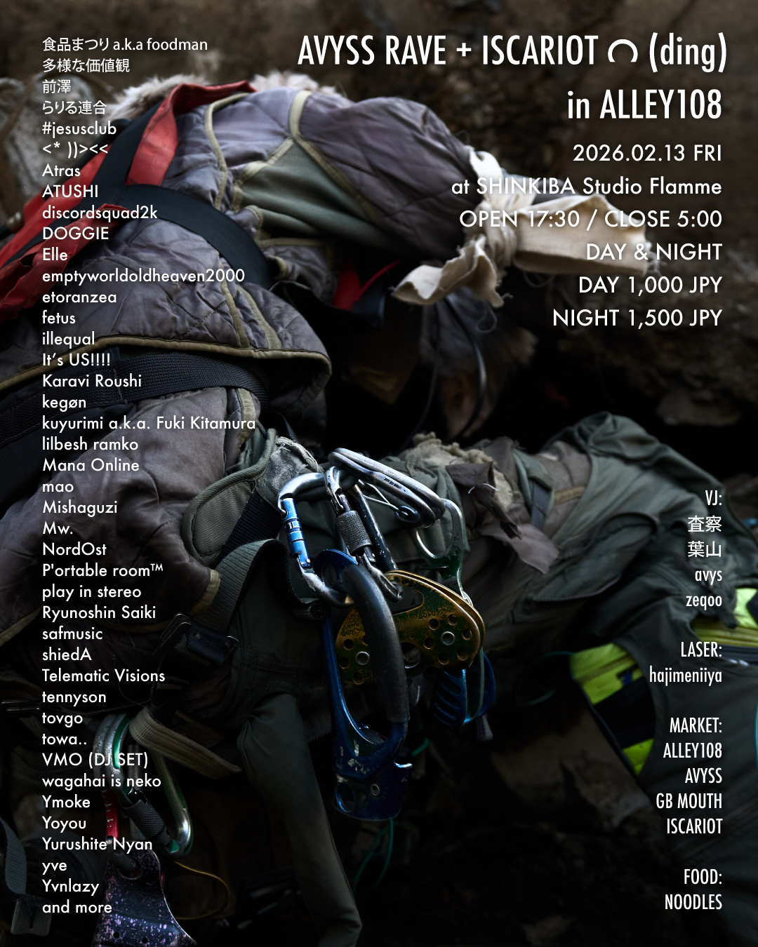 当初はライブやDJなどの音楽プログラムも同会場での実施を予定していたが(前回アナウンスの詳細)、諸事情により音楽プログラムのみ会場を新木場・Studio Flammehへと移し、2月13日(金)に「AVYSS RAVE」と「ISCARIOT ᭦ (ding)」が合流して開催されることとなった。