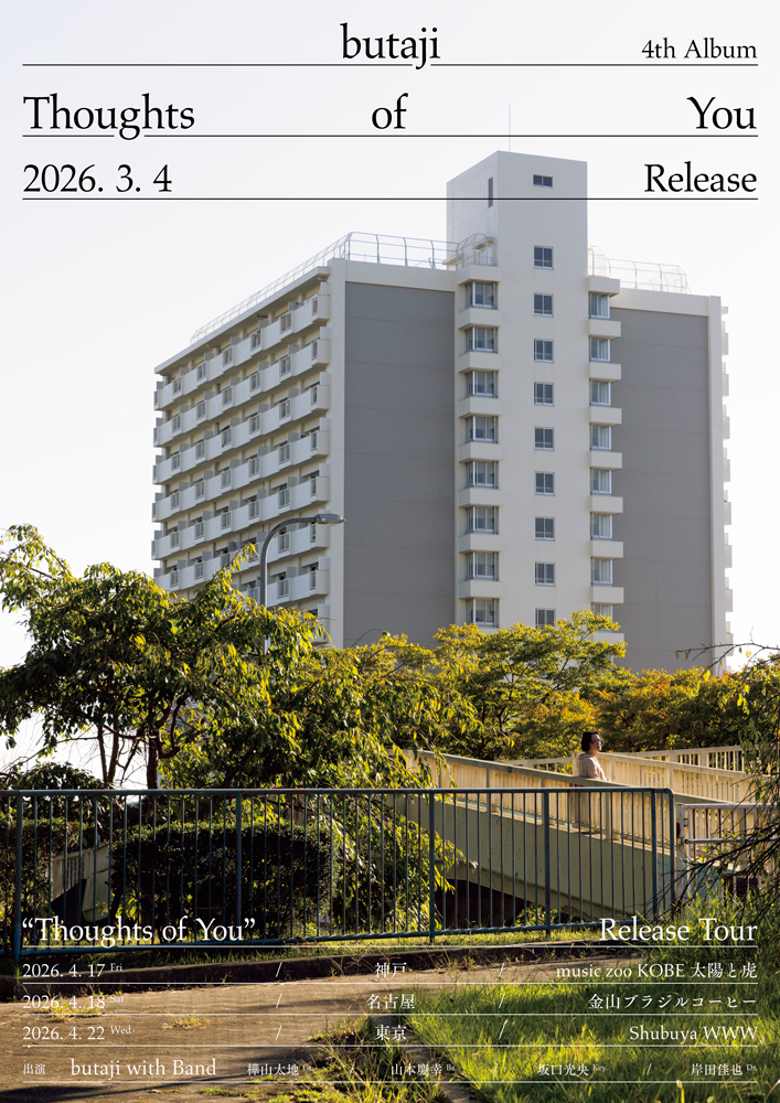 butajiの4thアルバム『Thoughts of You』が、3月4日にリリースされることが決定。あわせて、先行シングル「In silence」が2月4日にデジタル・リリースされるほか、アルバムのリリースを記念したツアー 「“Thoughts of You” Release Tour」 の開催も発表。東京公演は渋谷WWWにて開催される。