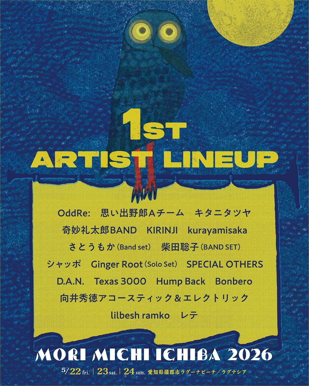 5/23 – 5/25 愛知県蒲郡市ラグーナビーチ&ラグナシア 東海地方に根ざした地域密着型の野外フェス「森、道、市場」が今年も開催決定。愛知県蒲郡市のラグーナビーチ&ラグナシアを会場に、2025年5月23日(金)、24日(土)、25日(日)の3日間にわたって開催される。各種チケットも2月10日(月)正午より販売開始。 本日発表された第一弾出演者は、ASOUND、UA、OKAMOTO’S、折坂悠太 (band)、Kohjiya、CENT、Chilli Beans.、鎮座DOPENESS、NOT WONK、Buffalo Daughter、YOUR SONG IS GOODの11組。 また、昨年開催された「森、道、市場 2024」のアフタームービーも第一弾出演者の発表に伴い同時公開。360°のパノラマ映像での閲覧も可能とのこと。 森、道、市場2025 日時:2025年5月23日(金) 11:00~、24日(土) 10:00~、25日(日) 10:00~ 会場:愛知県蒲郡市ラグーナビーチ&ラグナシア 主催:森、道、市場実行委員会 第一弾出演者: ASOUND / UA / OKAMOTO’S / 折坂悠太(band)/ Kohjiya / CENT / Chilli Beans. / 鎮座DOPENESS / NOT WONK / Buffalo Daughter / YOUR SONG IS GOOD / and more… https://morimichiichiba.jp/
