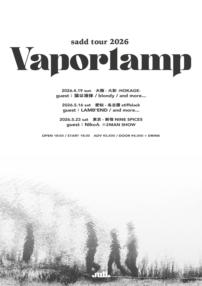 初の全国ツアー sadd tour 2026 “Vaporlamp” の開催も決定。大阪では猫は液体、blondy。名古屋はLAMB’S END。東京公演はNikoんと共演アーティストもあわせて発表された。ツアーのゲスト・会場は随時追加される予定。チケットはぴあにて先行受付中。