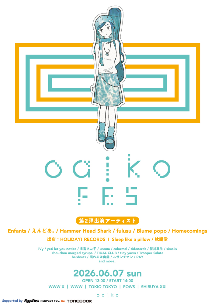 「Oaiko FES 2026」の第2弾アーティストを発表しました。第2弾では、新たにレーベルに加わったfulusuをはじめ、今のオルタナティブシーンを語る上で欠かせない6組が加わりました。そして、Oaikoが作ろうとしているシーンを語る上で欠かせない存在として、HOLIDAY! RECORDSとSleep like a pillow / 枕眠堂の出店も決定しました。