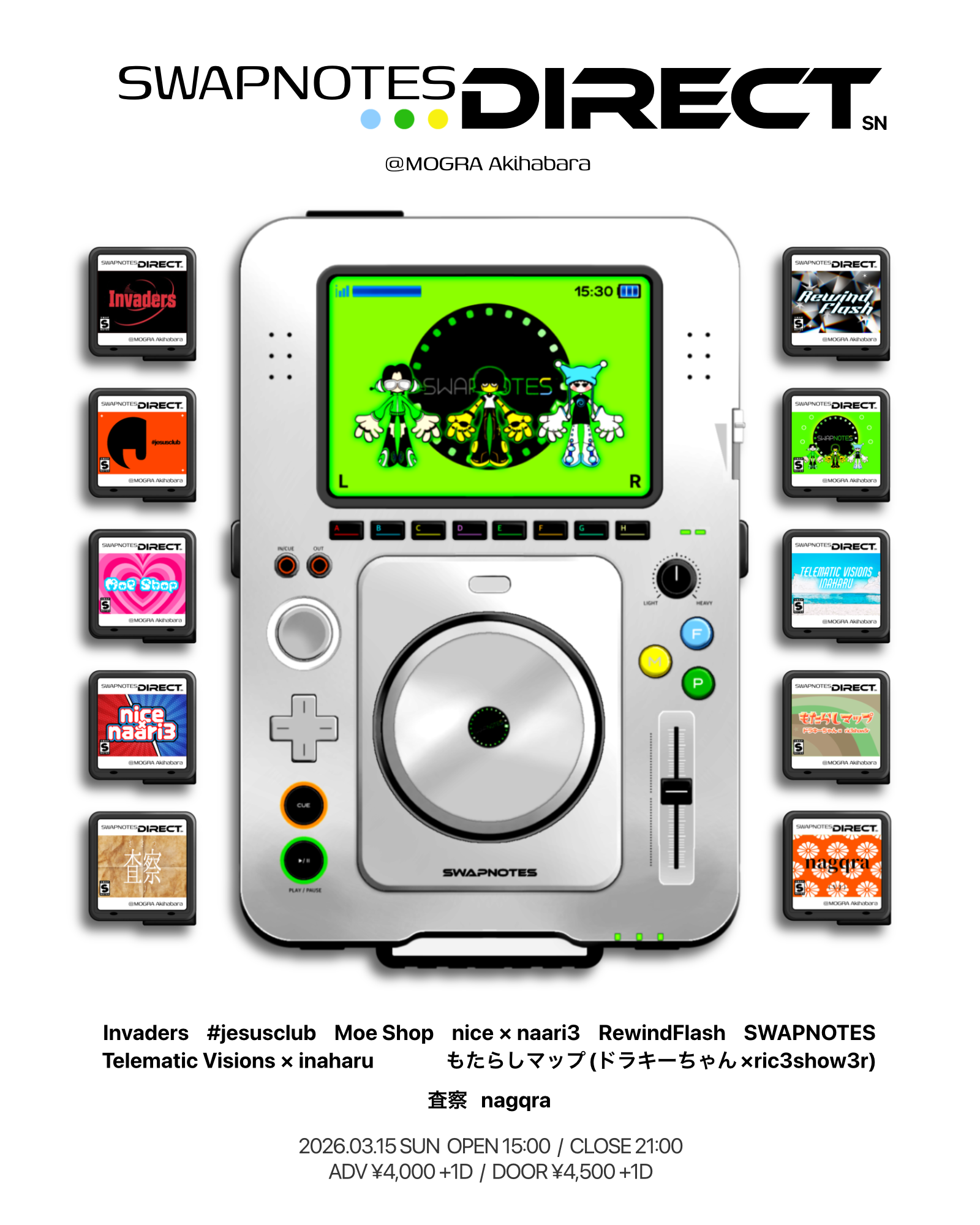主催のSWAPNOTESをはじめに、#jesusclubやMoe Shop、nice × naari3、RewindFlash、Telematic Visions × inaharu、もたらしマップ(ドラキーちゃん × ric3show3r)らがアクトとして集結。