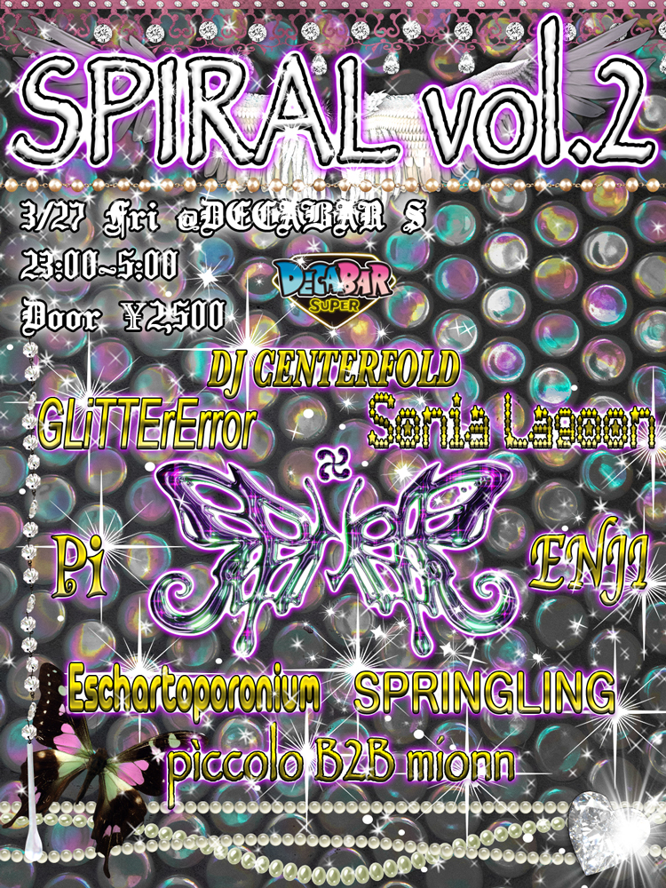 2026年3月27日(金)、BASiRiNOとrakoによるB2Bユニット・GLiTTErErrorによるジャンルレスパーティー〈SPIRAL vol.2〉が開催。「Genreless hard」をテーマに熱狂の渦を生んだvol.1から約2年ぶりの開催となる今回は、ベニューを新宿歌舞伎町に位置するDECABAR Sに移し、「2010’s party pop」をテーマにパーティの更なる拡張を感じさせる8組のDJがラインナップ。